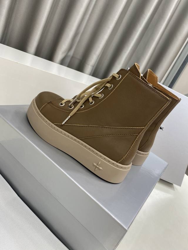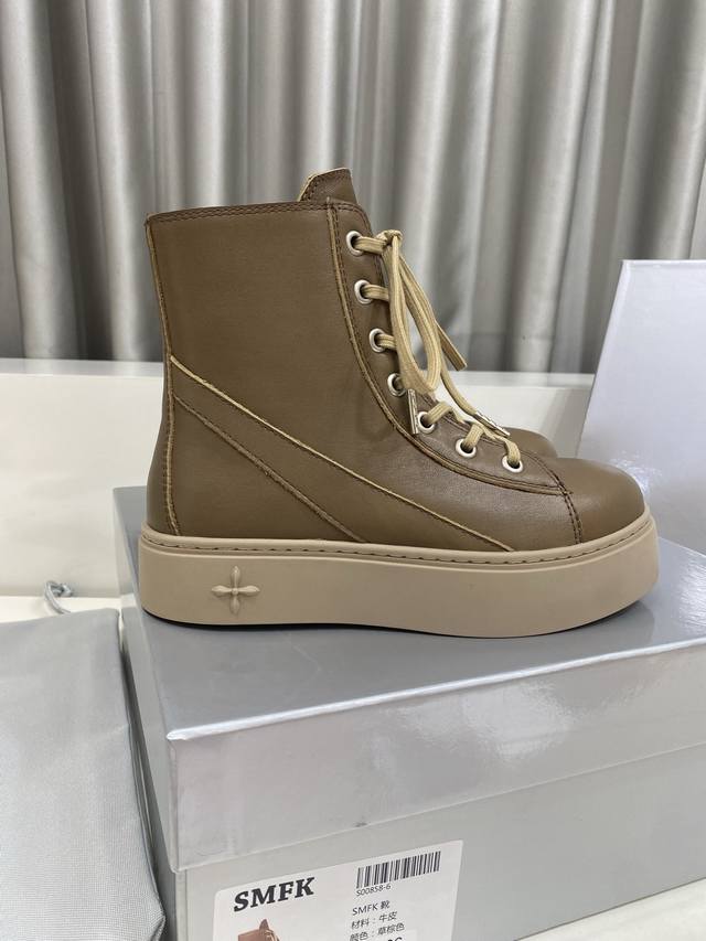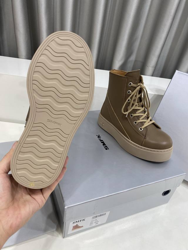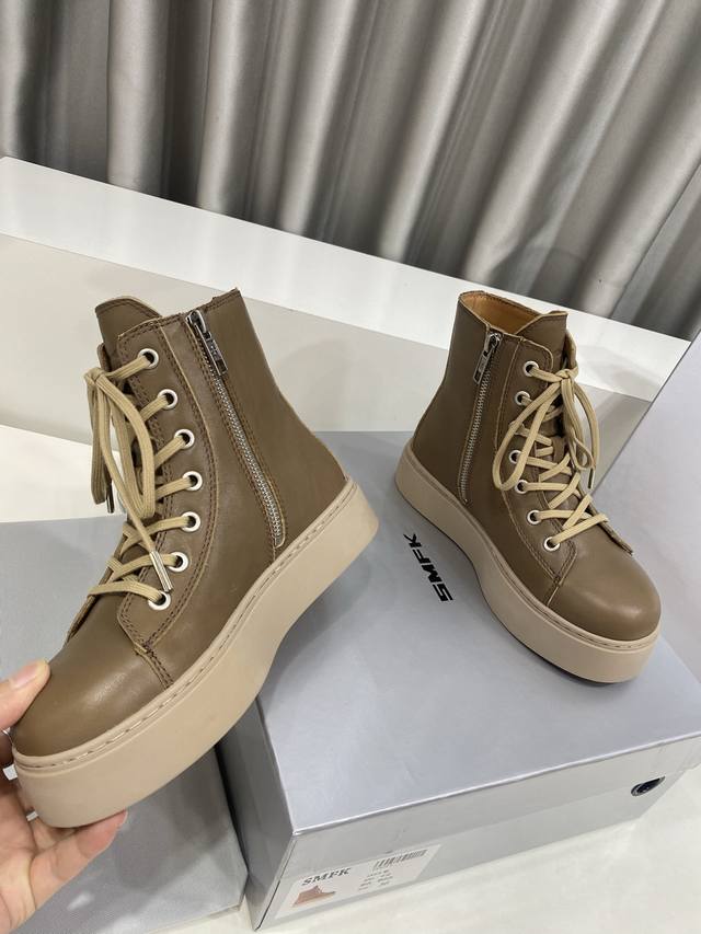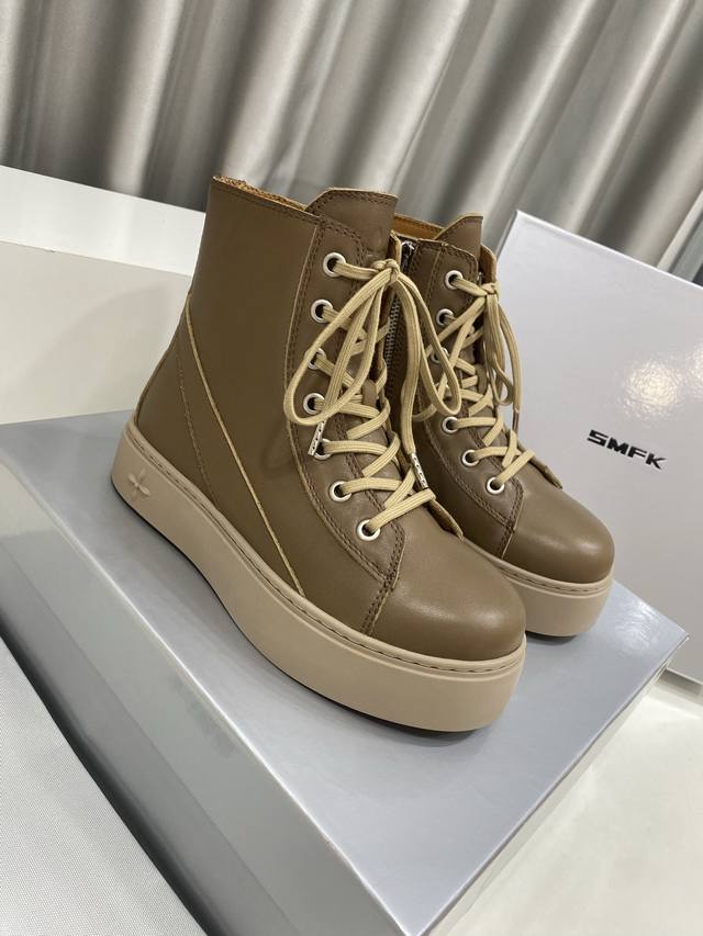 Smfk 小众潮牌 25Ss爆款新品 厚底 休闲鞋 马丁靴 这双Smfk单品,完美诠释了品牌独特的潮流态度与先锋设计理念。 厚底巧妙拉长腿部线条,让穿着者轻松拥有出众的身材比例 。而厚底侧面那一抹亮眼的尖角十字花图案,作为Smfk的标志性元素之一,不仅凸显了品牌特色,更赋予了鞋子独一无二的辨识度。 无论是搭配Smfk经典的运动套装,展现活力满满的运动时尚感;还是与简约的牛仔单品相组合,打造街头潮流风格,这双单品都能凭借其独特的设计和品牌魅力,成为穿搭中的焦点,让你自信地走在时尚前沿,释放独属于自己的潮流态