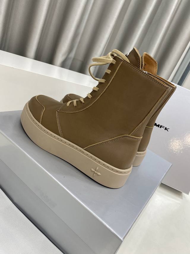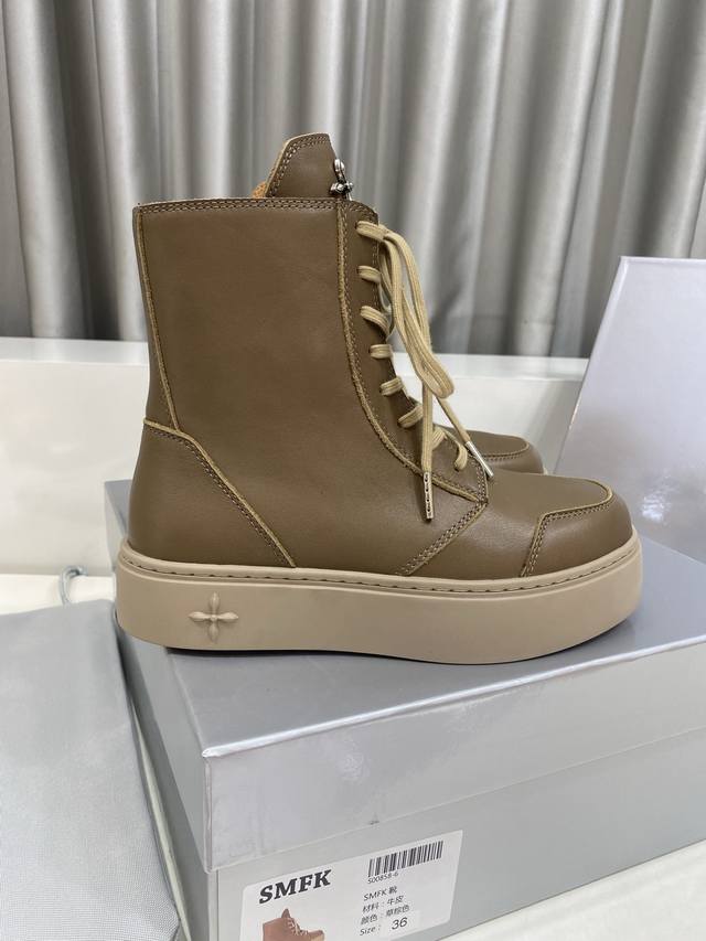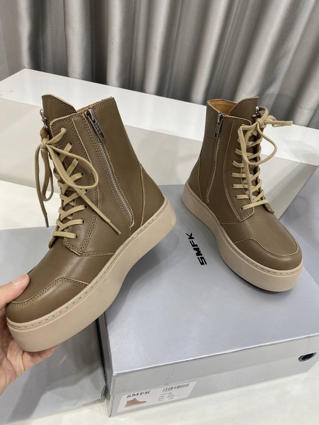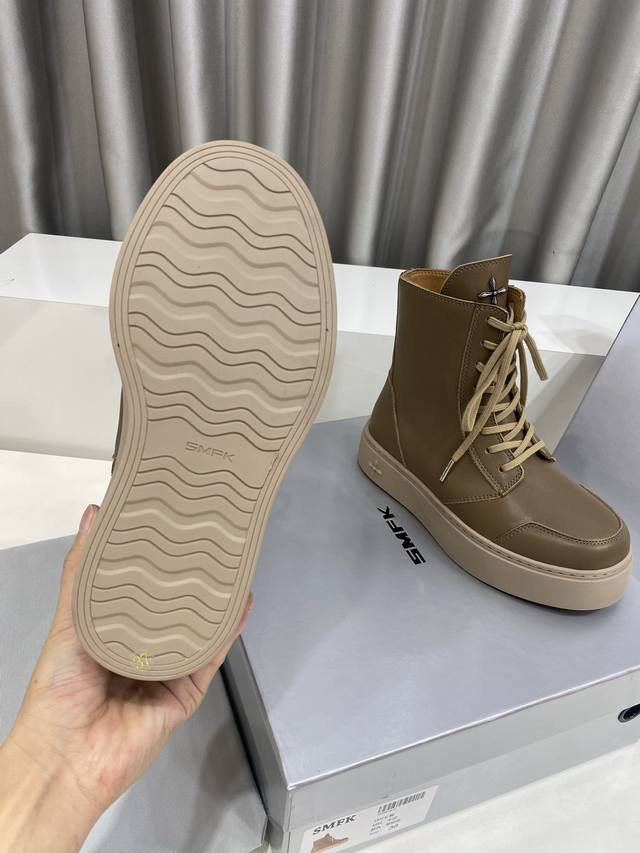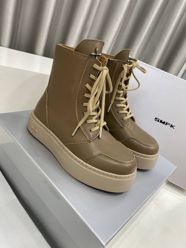Smfk 小众潮牌 25Ss爆款新品 厚底 休闲鞋 马丁靴 这双Smfk单品,完美诠释了品牌独特的潮流态度与先锋设计理念。 厚底巧妙拉长腿部线条,让穿着者轻松拥有出众的身材比例 。而厚底侧面那一抹亮眼的尖角十字花图案,作为Smfk的标志性元素之一,不仅凸显了品牌特色,更赋予了鞋子独一无二的辨识度。 无论是搭配Smfk经典的运动套装,展现活力满满的运动时尚感;还是与简约的牛仔单品相组合,打造街头潮流风格,这双单品都能凭借其独特的设计和品牌魅力,成为穿搭中的焦点,让你自信地走在时尚前沿,释放独属于自己的潮流态