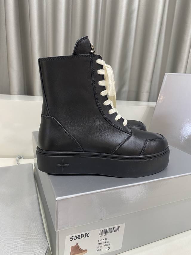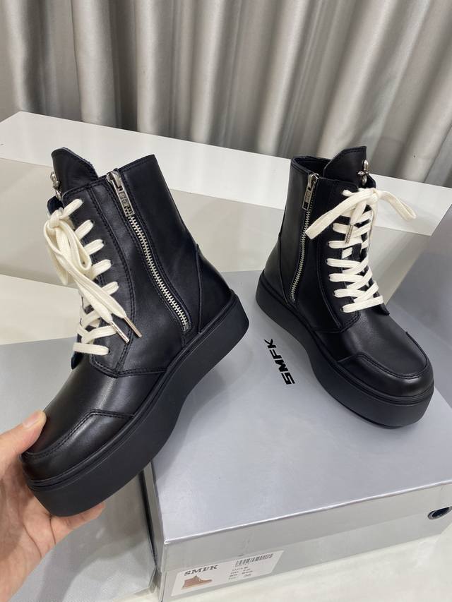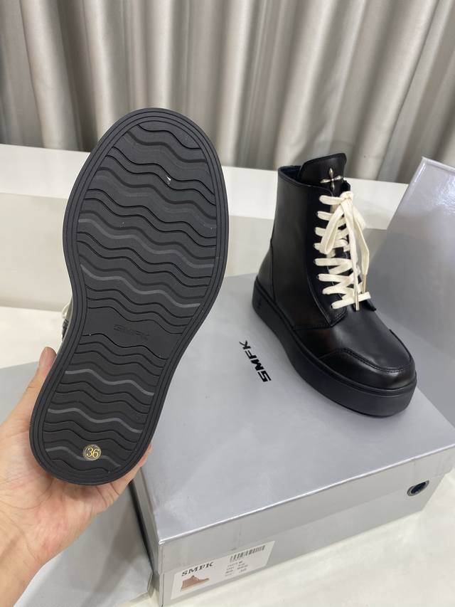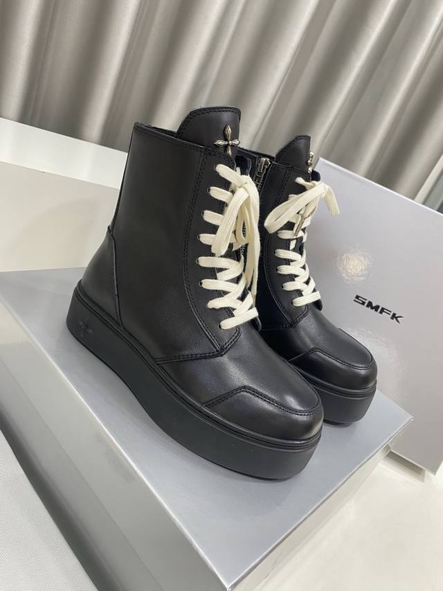 Smfk 小众潮牌 25Ss爆款新品 厚底 休闲鞋 马丁靴 这双Smfk单品,完美诠释了品牌独特的潮流态度与先锋设计理念。 厚底巧妙拉长腿部线条,让穿着者轻松拥有出众的身材比例 。而厚底侧面那一抹亮眼的尖角十字花图案,作为Smfk的标志性元素之一,不仅凸显了品牌特色,更赋予了鞋子独一无二的辨识度。 无论是搭配Smfk经典的运动套装,展现活力满满的运动时尚感;还是与简约的牛仔单品相组合,打造街头潮流风格,这双单品都能凭借其独特的设计和品牌魅力,成为穿搭中的焦点,让你自信地走在时尚前沿,释放独属于自己的潮流态