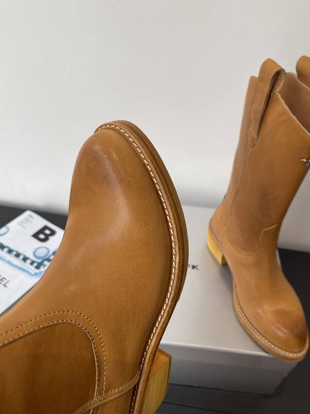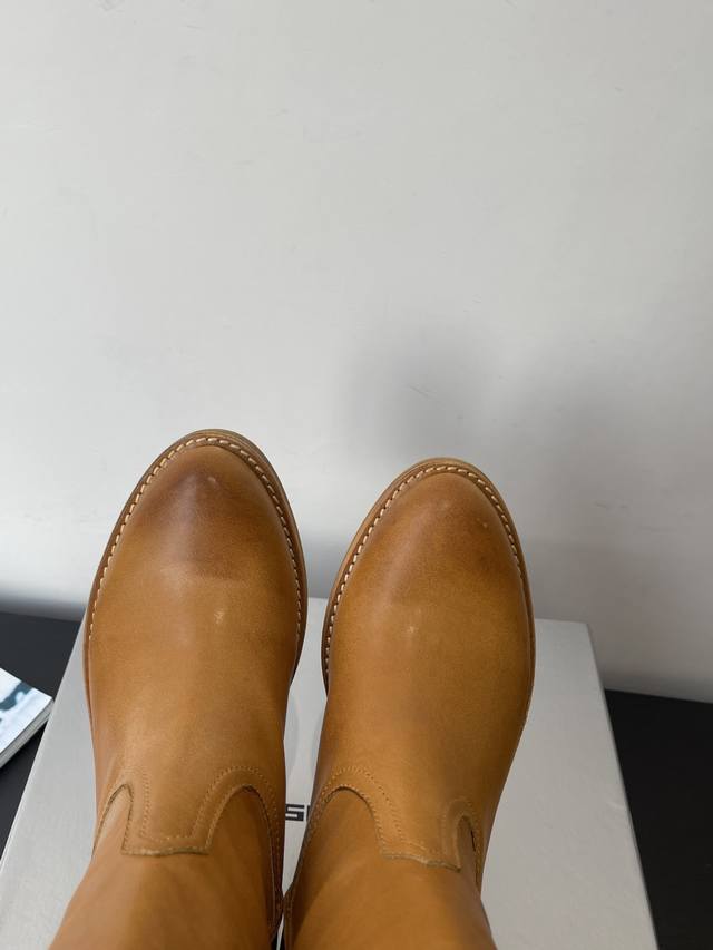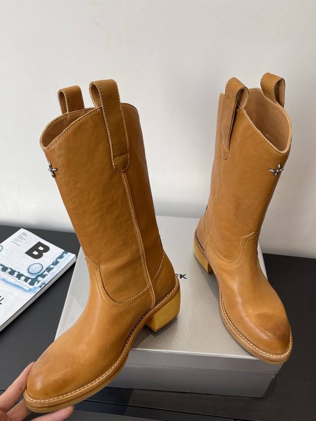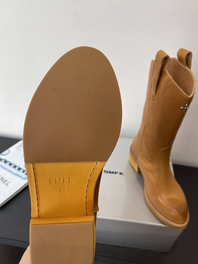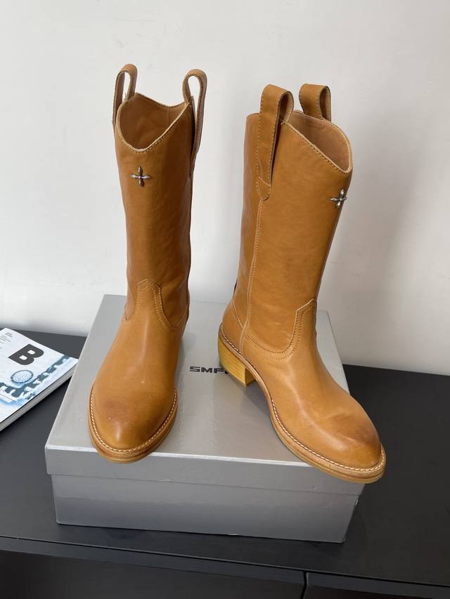 Smfk 秋冬新款 十字花金属徽章 长靴 这双长靴 是很有质感的油蜡做旧色 配合植鞣牛皮面料制作而成 大底使用固特异工艺进行固定缝合 主要是上脚穿真的显腿细 超