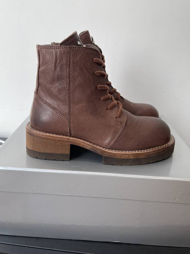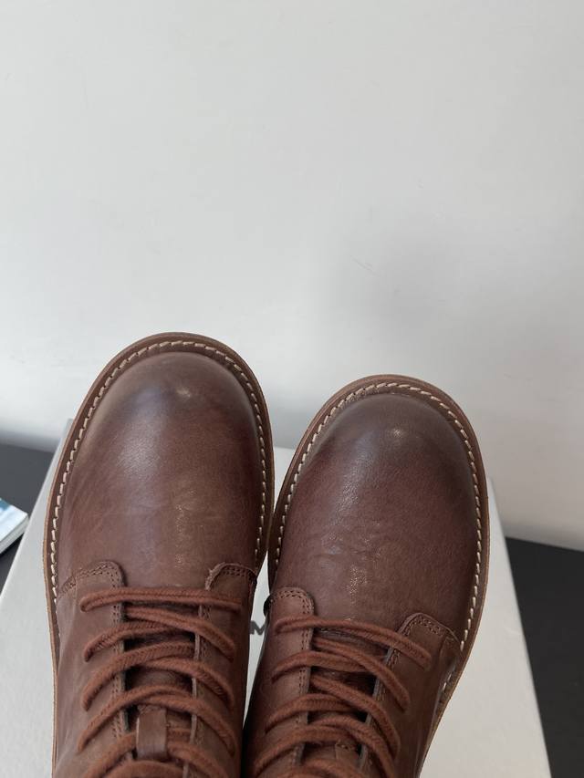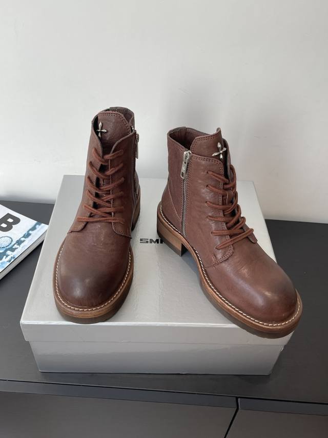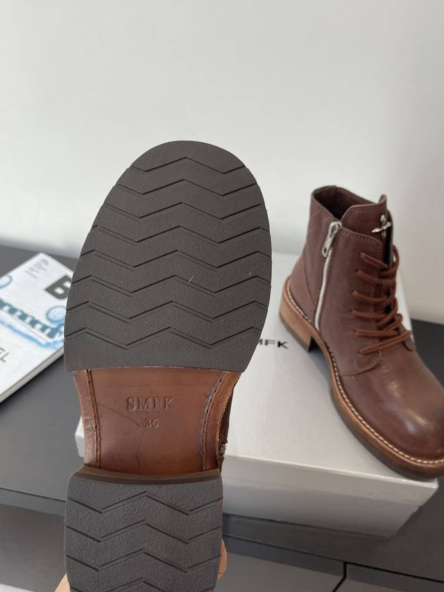 Smfk 秋冬新款 十字花金属徽章 马丁靴 这双长靴 是很有质感的油蜡做旧色 配合植鞣牛皮面料制作而成 大底使用固特异工艺进行固定缝合 主要是上脚穿真的显腿细
