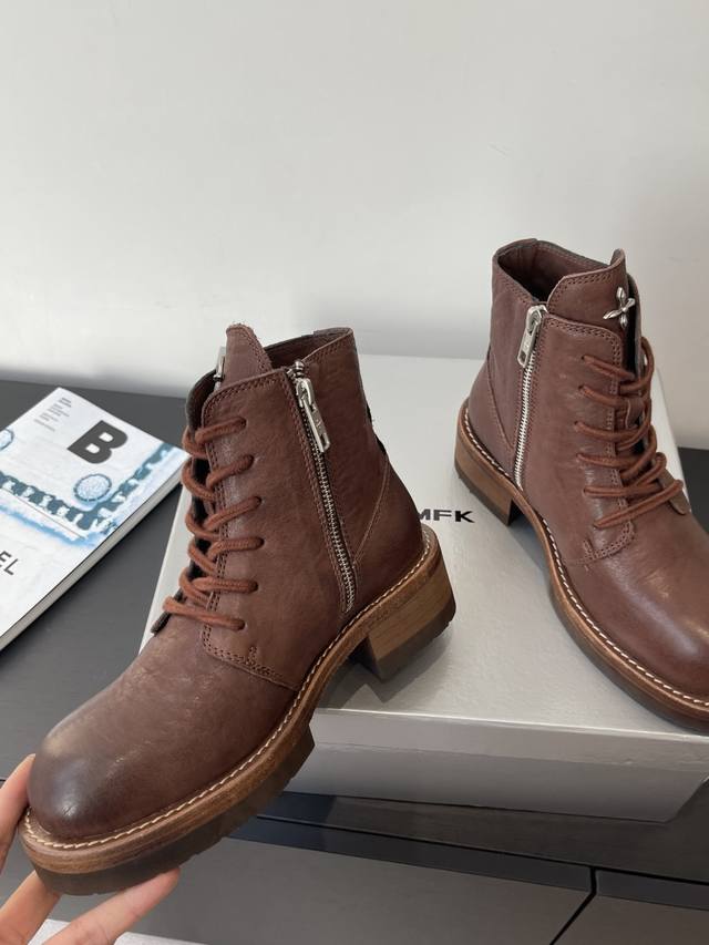 Smfk 秋冬新款 十字花金属徽章 马丁靴 DDD 这双长靴 是很有质感的油蜡做旧色 配合植鞣牛皮面料制作而成 大底使用固特异工艺进行固定缝合 主要是上脚穿真的显腿细 超级百搭出彩帅气 DDD 面料进口做旧马皮 内里牛皮 鞋底原版开模 DDD 码数:35-40 40定做 DDD