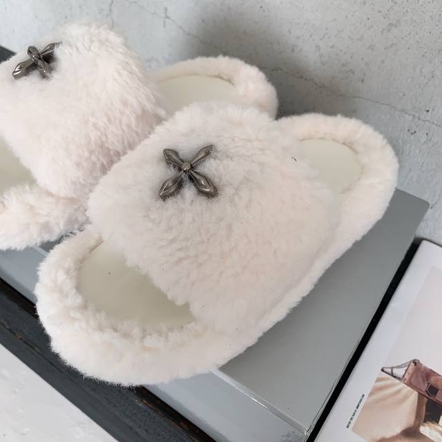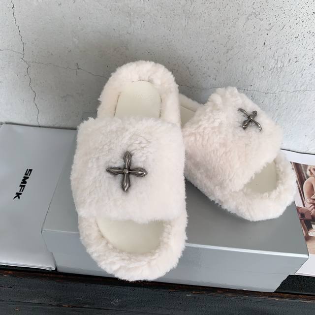 / Smfk 2025秋冬新款厚底毛毛拖鞋,全新Sm十字花系列,增高5Cm,行走的大长腿对版羊羔毛面料,羊皮内里,私模橡胶防滑大底,码数:35-39# 40#可订做