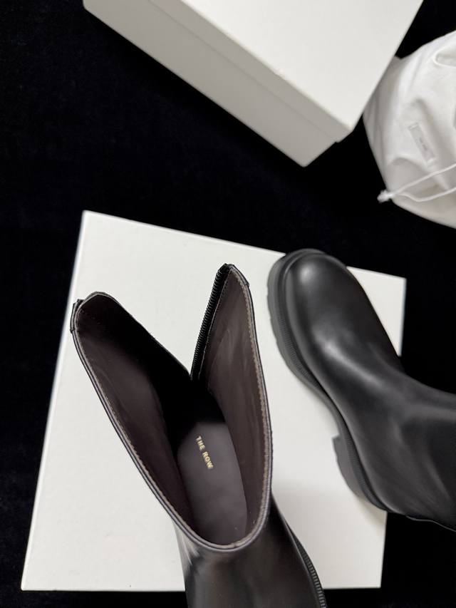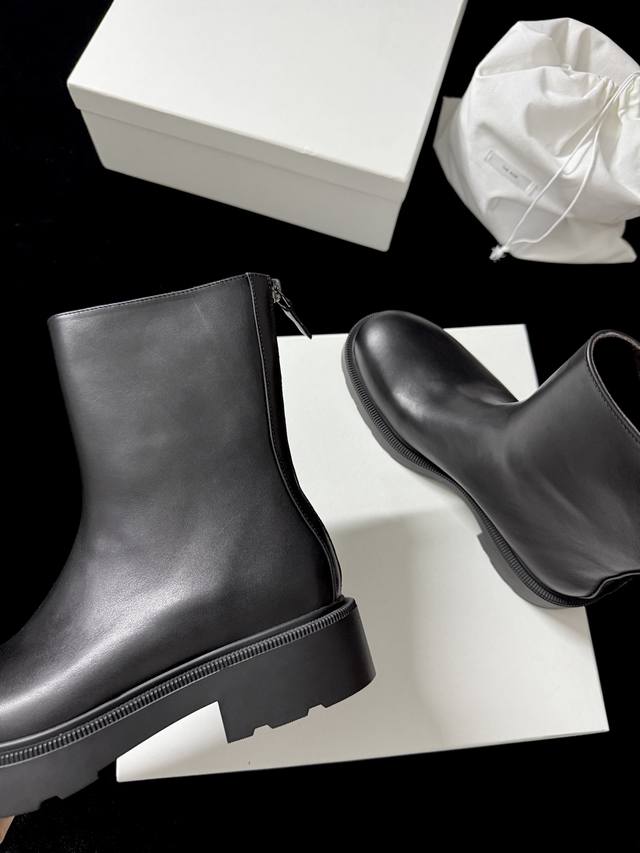 The Ro* 新品 极简风 简直是时髦密码 柔滑皮革质感拉满 后拉链设计利落又别致 厚底还能悄悄**~ 不管是搭配裙装还是裤装 都能轻松打造出高级感满满的造型
