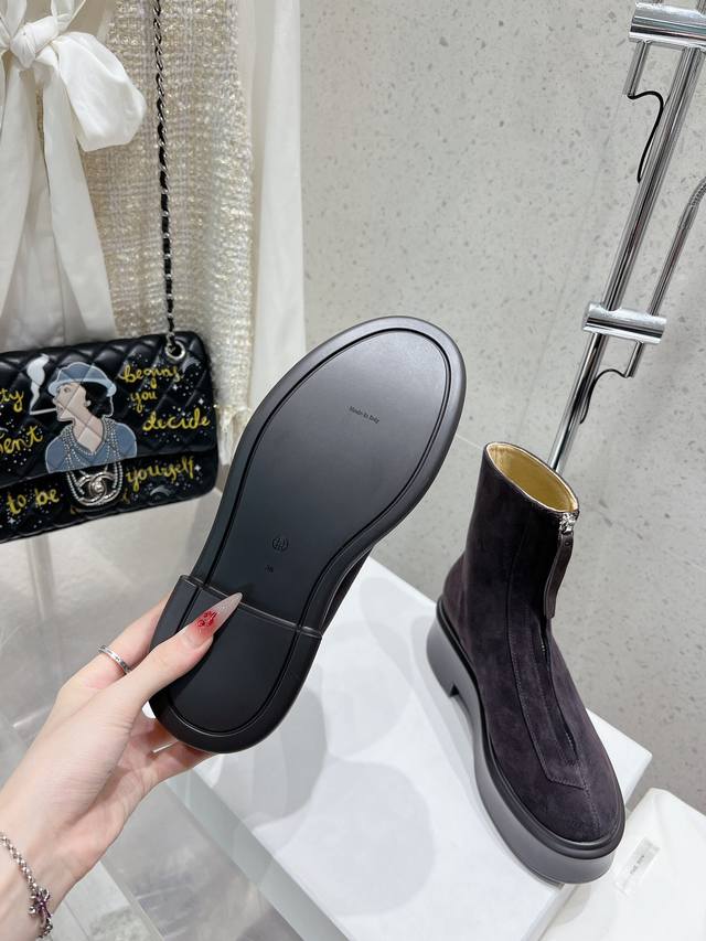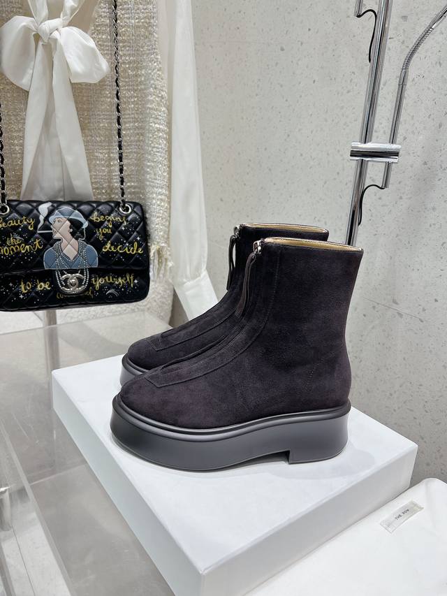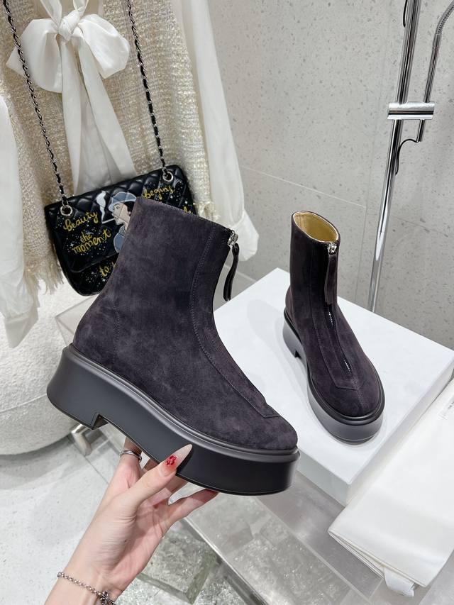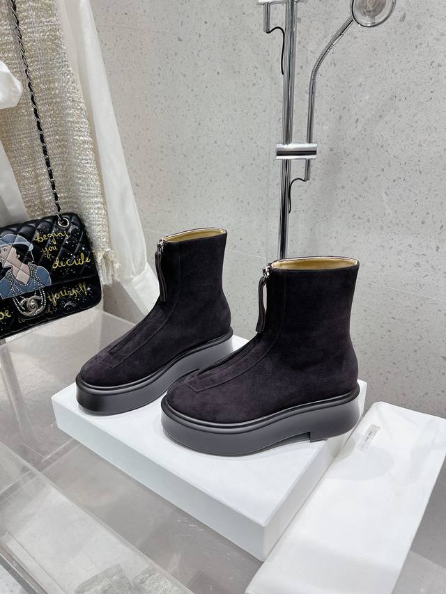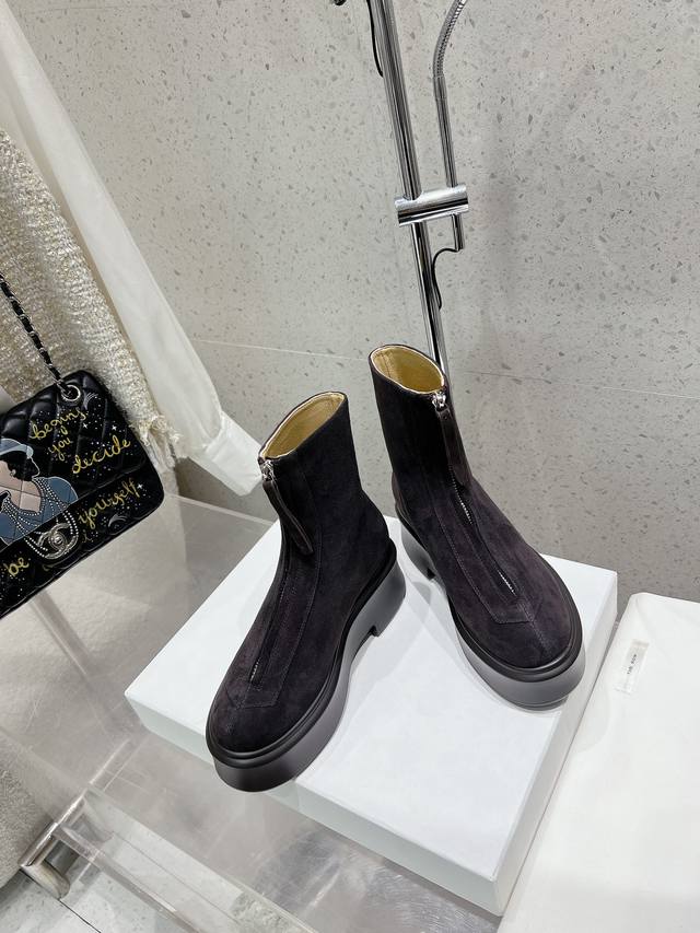 The Row 秋冬新款中缝拉链经典厚底短靴。刘雯同款,超多明星示范原版购入 顶级还原。鞋面原版定制进口小牛皮超柔软混种羊皮内里垫脚。前拉链的设计,简约时髦!上