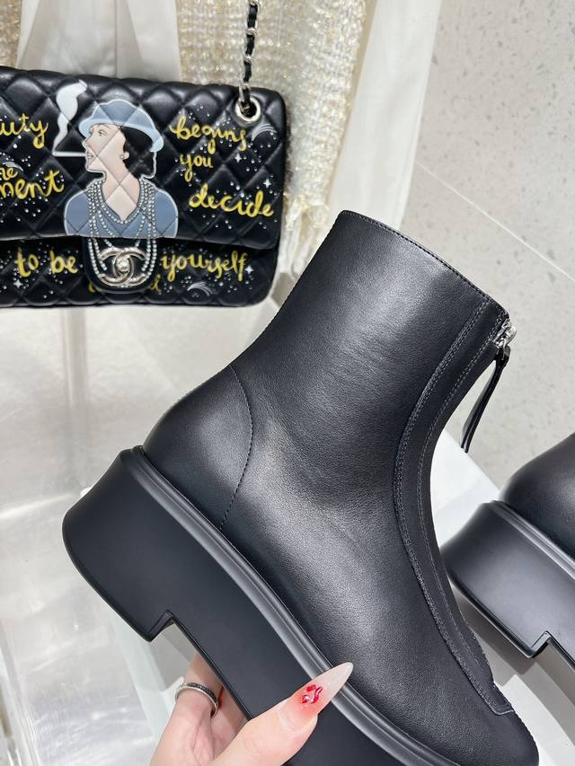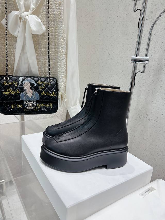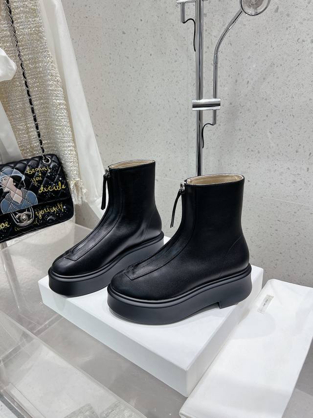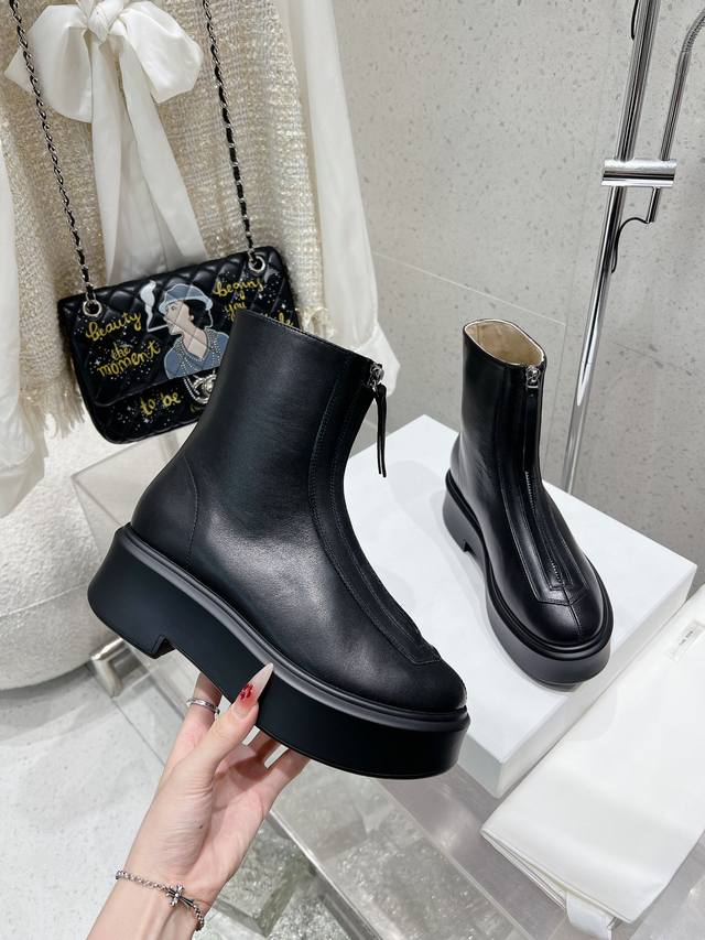 The Row 秋冬新款中缝拉链经典厚底短靴。刘雯同款,超多明星示范原版购入 顶级还原。鞋面原版定制进口小牛皮超柔软混种羊皮内里垫脚。前拉链的设计,简约时髦!上