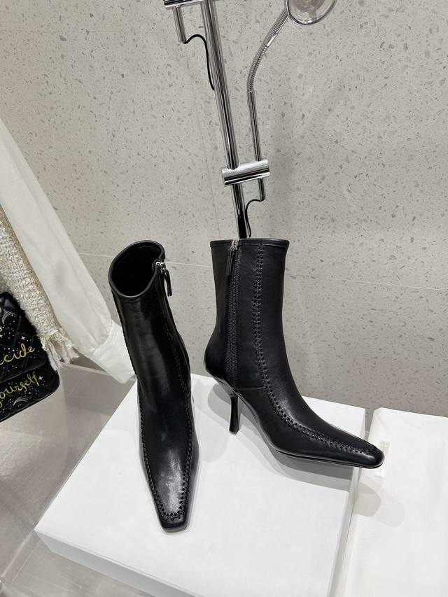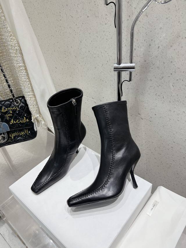 The Row 秋冬新款方头缝线侧拉链细跟短靴裸靴