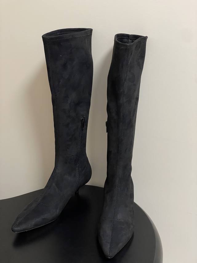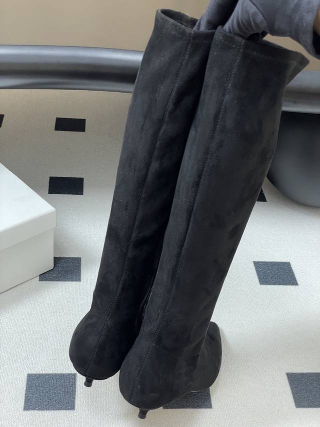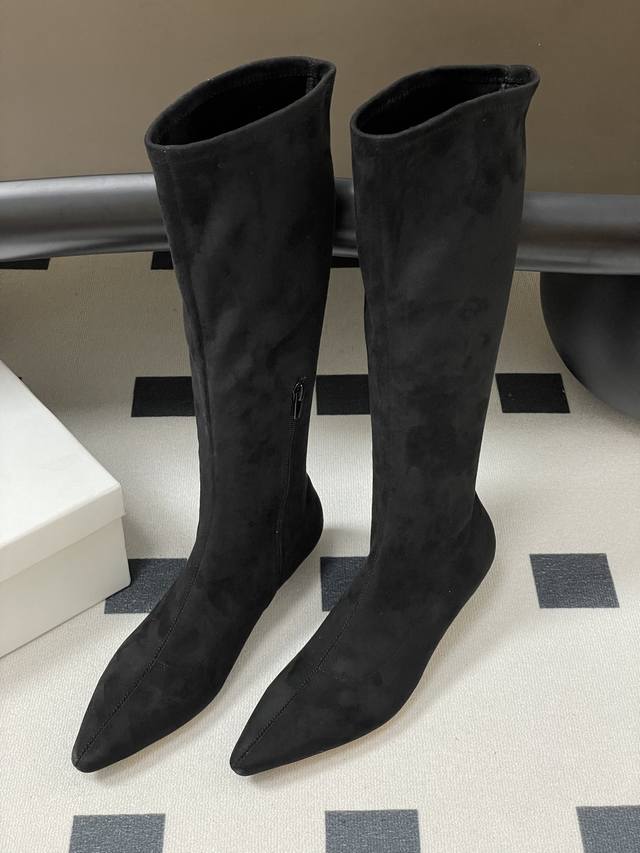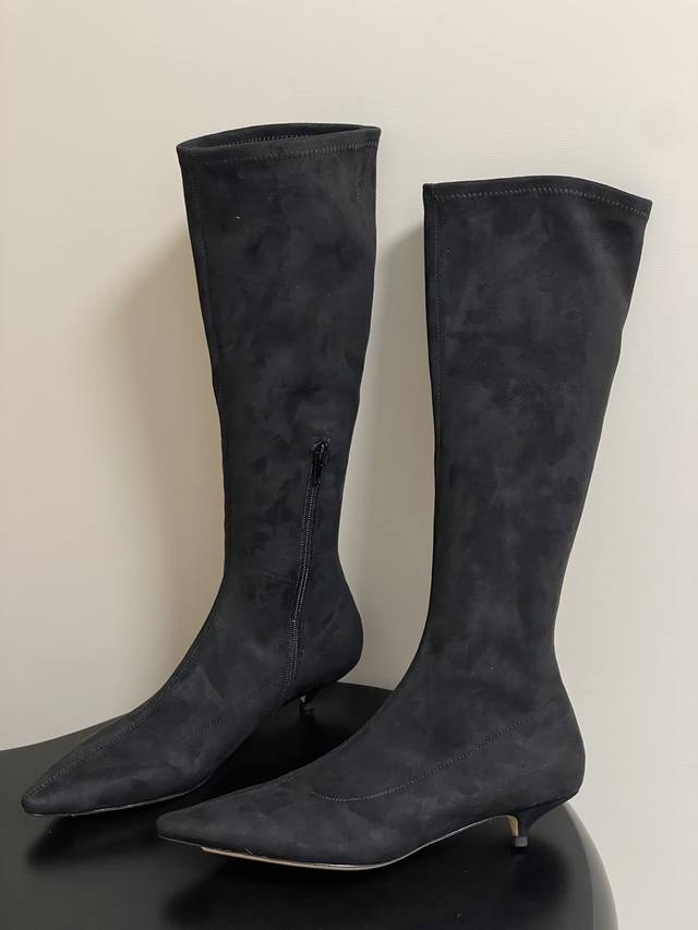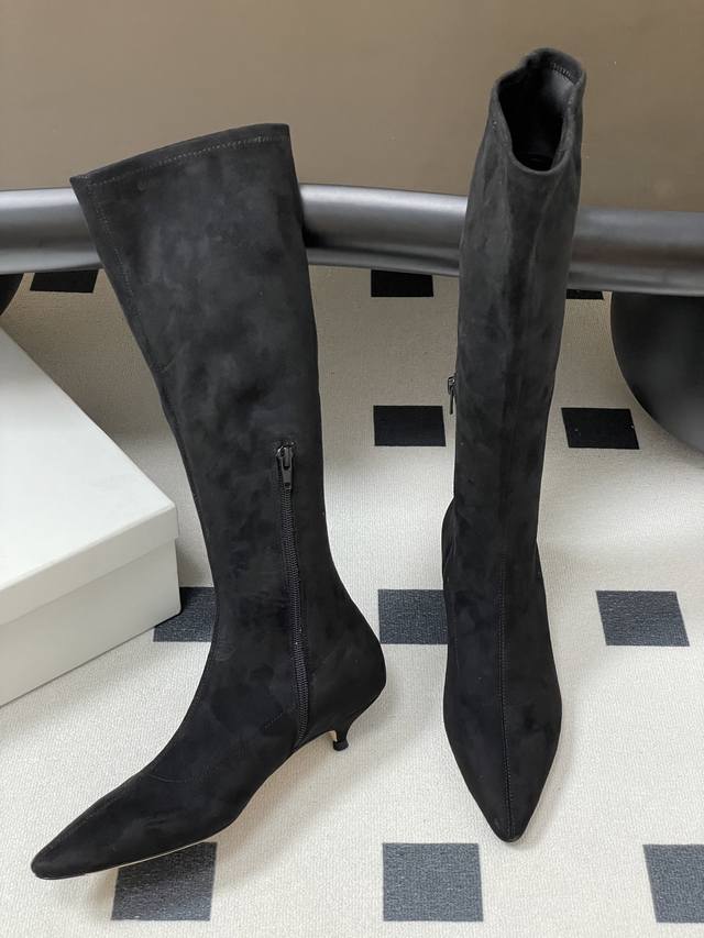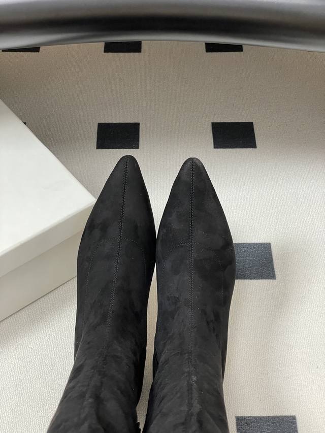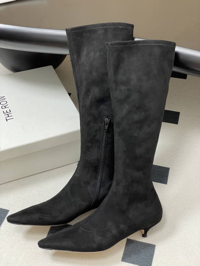 The Row 2025早秋新款 Tr弹力短靴小猫跟长靴 这双长靴呈现出优雅又不失个性的风格,结合了时装靴的精致感与一定的时尚先锋性,适合搭配多种风格的服装,从简约的日常装到个性的晚宴造型都能适配。 弹力绒面材质,这种材质不仅贴合腿部线条,能很好地修饰腿型,让腿部看起来更修长流畅,而且绒面材质自带一种高级的哑光质感,增添了靴子的奢华感与复古氛围。靴筒的高度属于中高筒范围,能够覆盖到小腿部分,对小腿线条有一定的包容和修饰作用。 鞋面:定制弹力麂皮绒 内里垫脚:弹力莱卡 鞋底:意大利真皮大底 跟高:3Cm 8