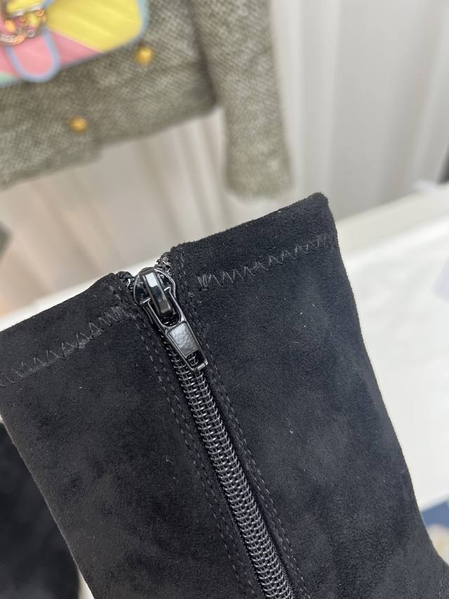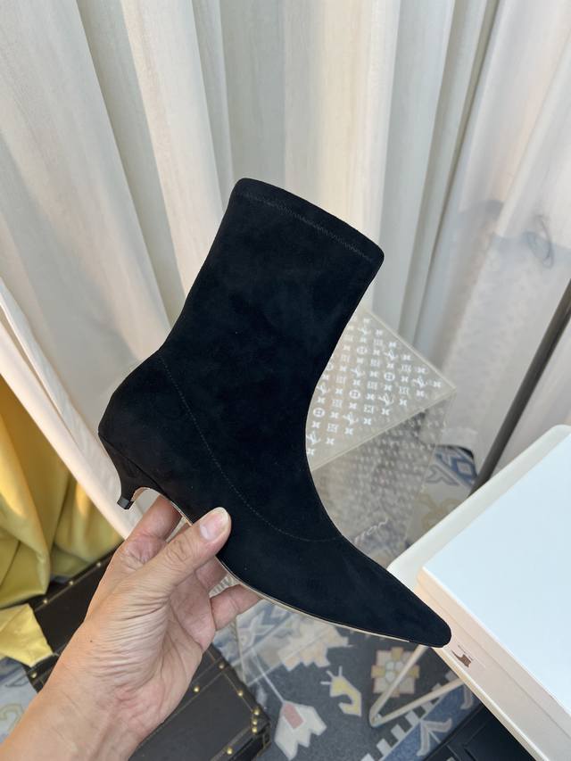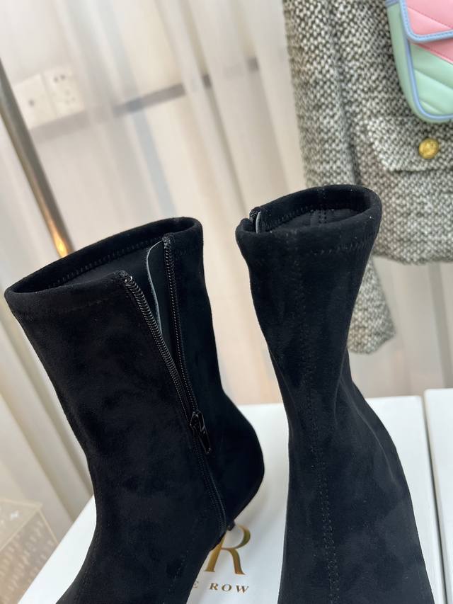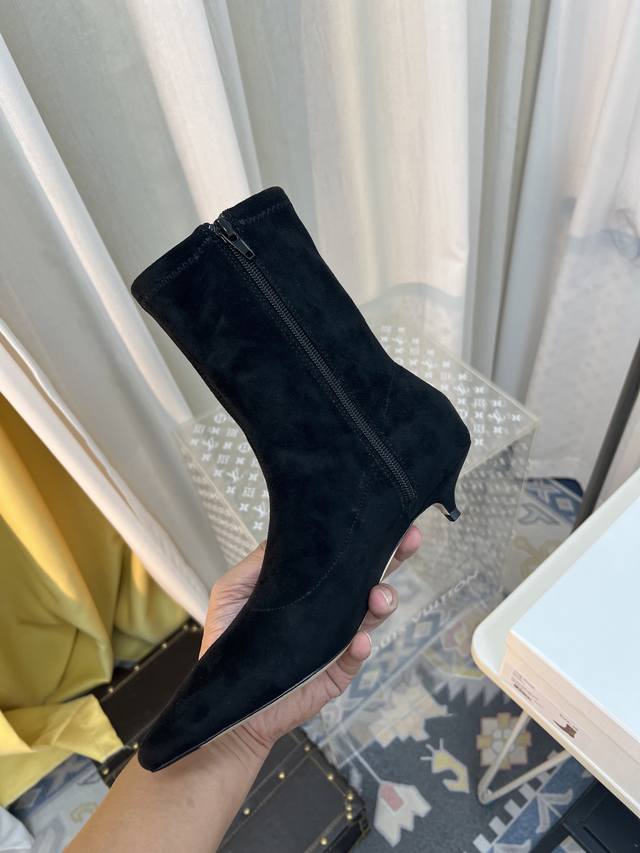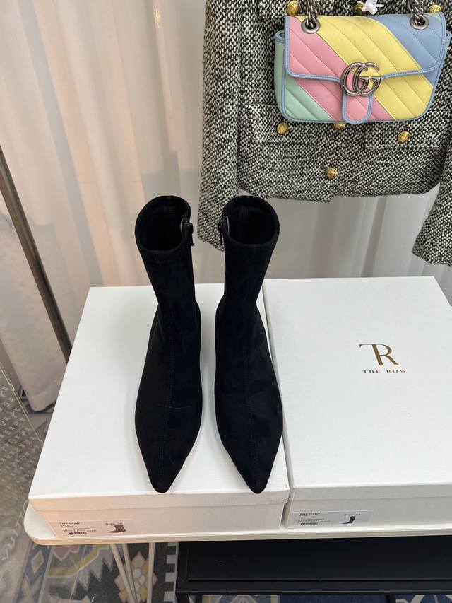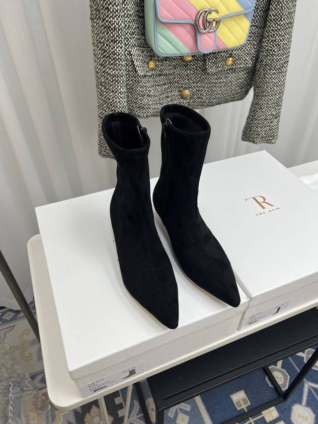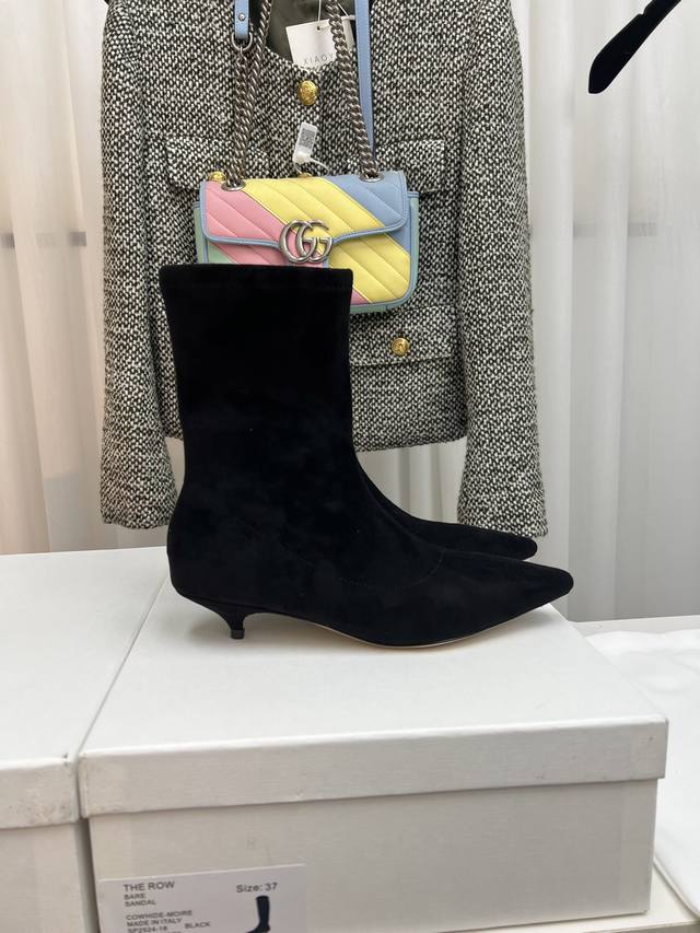 The Row 2025早秋新款 Tr弹力短靴小猫跟 这双短靴呈现出优雅又不失个性的风格,结合了时装靴的精致感与一定的时尚先锋性,适合搭配多种风格的服装,从简约的日常装到个性的晚宴造型都能适配。 弹力绒面材质,这种材质不仅贴合腿部线条,能很好地修饰腿型,让腿部看起来更修长流畅,而且绒面材质自带一种高级的哑光质感,增添了靴子的奢华感与复古氛围。靴筒的高度属于中高筒范围,能够覆盖到小腿部分,对小腿线条有一定的包容和修饰作用。 鞋面:定制羊京弹力绒 内里垫脚:羊皮 鞋底:意大利真皮大底 跟高:3Cm 码数:35