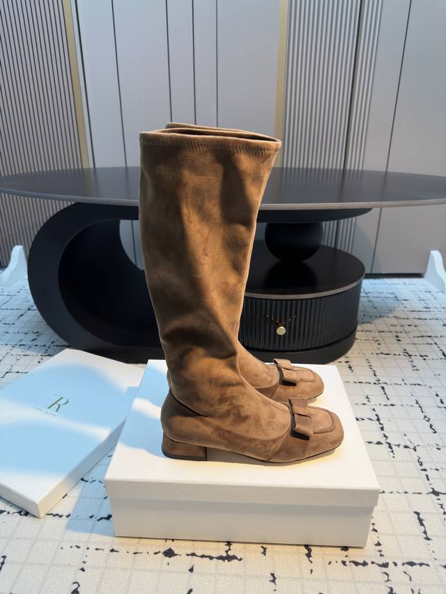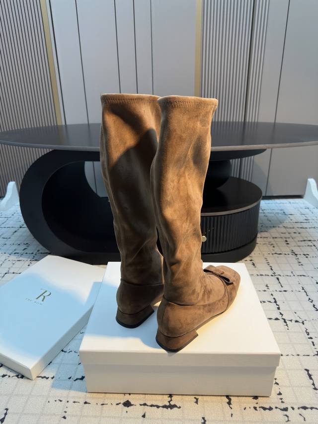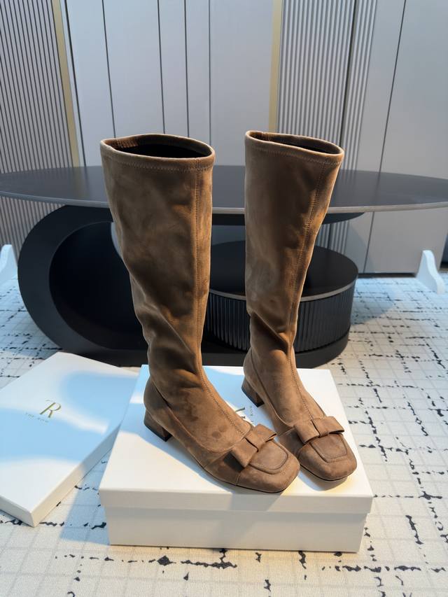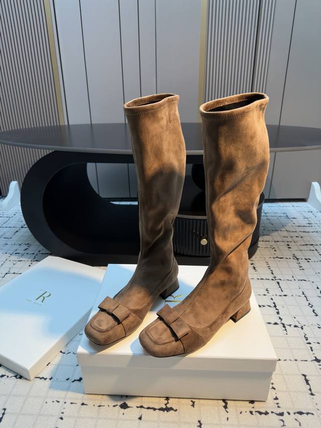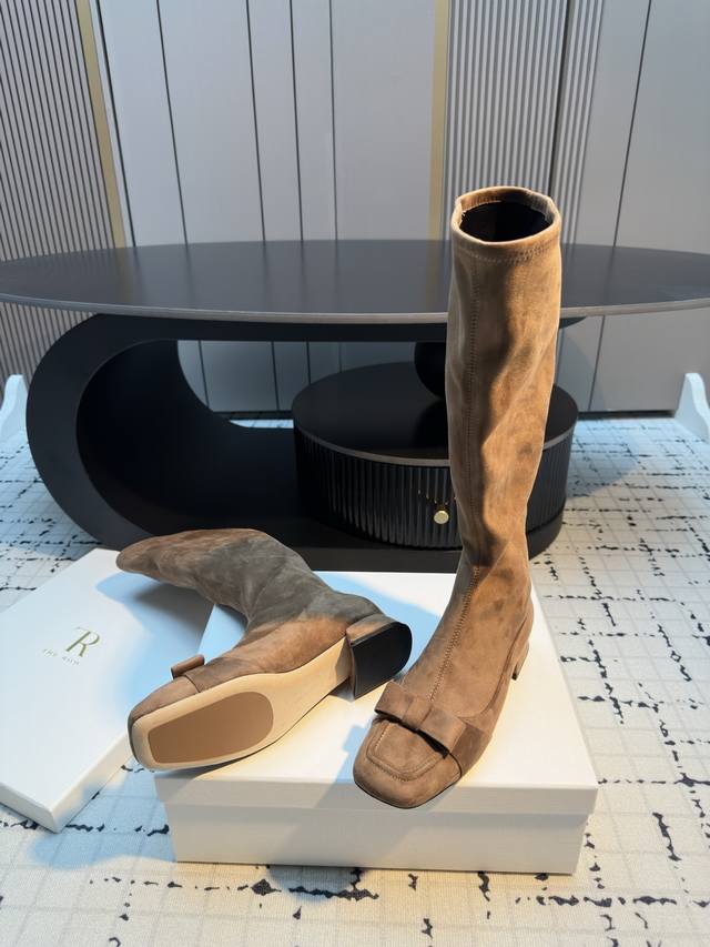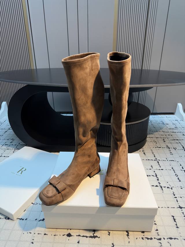 The Row 2025早秋新款 Tr弹力蝴蝶结长靴小方跟 DDD 这双方头长靴呈现出优雅又不失个性的风格,结合了时装靴的精致感与一定的时尚先锋性,适合搭配多种风格的服装,从简约的日常装到个性的晚宴造型都能适配。 DDD 弹力绒面材质,这种材质不仅贴合腿部线条,能很好地修饰腿型,让腿部看起来更修长流畅,而且绒面材质自带一种高级的哑光质感,增添了靴子的奢华感与复古氛围。靴筒的高度属于中高筒范围,能够覆盖到小腿部分,对小腿线条有一定的包容和修饰作用。 DDD 鞋面:定制弹力绒 DDD 内里:羊皮 DDD 鞋底
