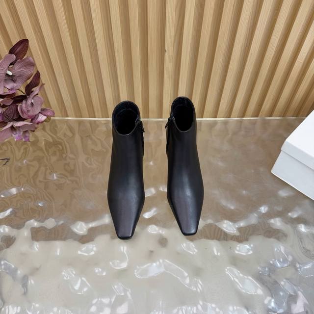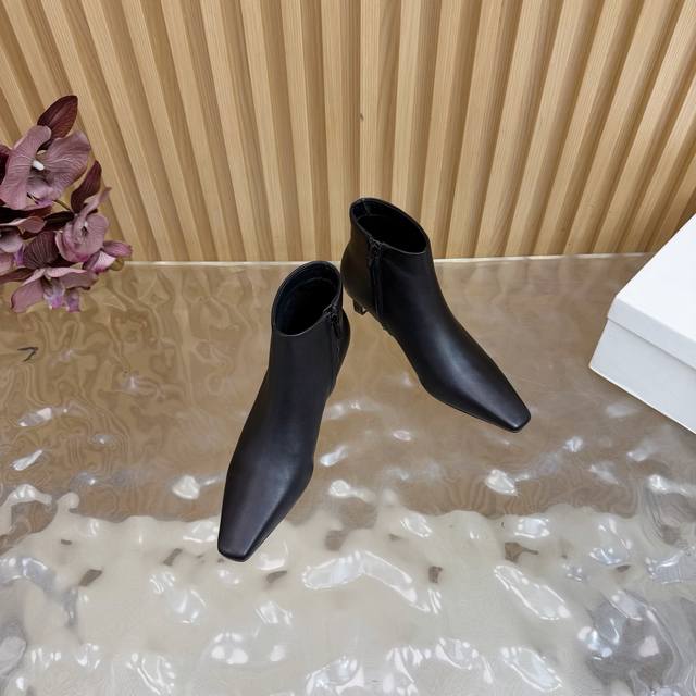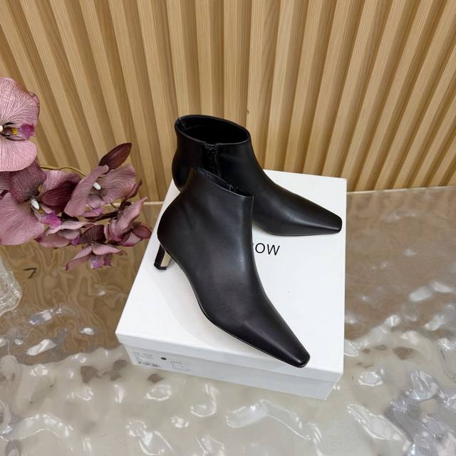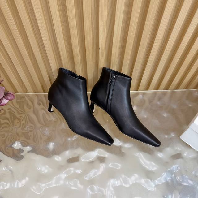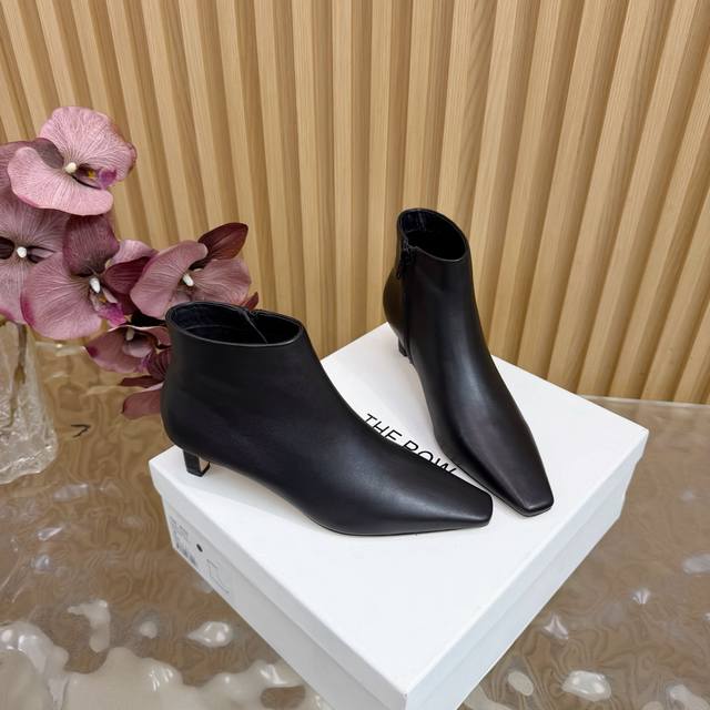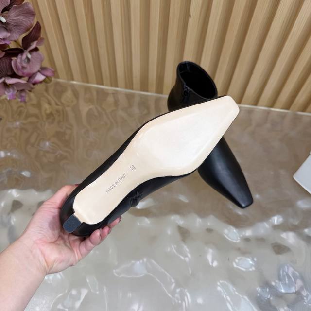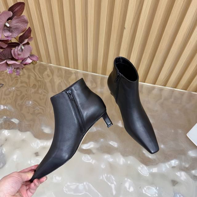 The Row 25S秋冬新款猫跟短靴 复古尖头元素 DDD 短靴 DDD 靴身线条利落流畅 从鞋头到靴筒一气呵成 DDD 尖头设计堪称腿长“作弊神器” DDD 瞬间延伸腿部线条 让双腿看起来笔直修长 DDD 无论你是搭配干练的西装裤 DDD 还是飘逸的连衣裙 都能完美适配 DDD 轻松营造出毫不费力的时髦感。 DDD 弹力面料的运用是这双靴子的神来之笔 DDD 贴合腿部曲线 不松不紧刚刚好 既能修饰腿型 DDD 又不会有束缚感 就算长时间穿着也自在舒适。 DDD 小高跟的高度恰到好处 提供了恰到好处的支