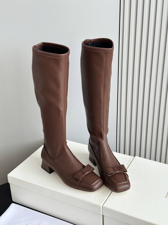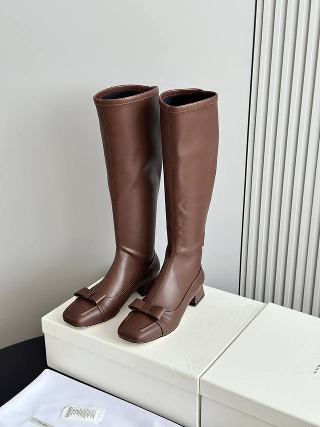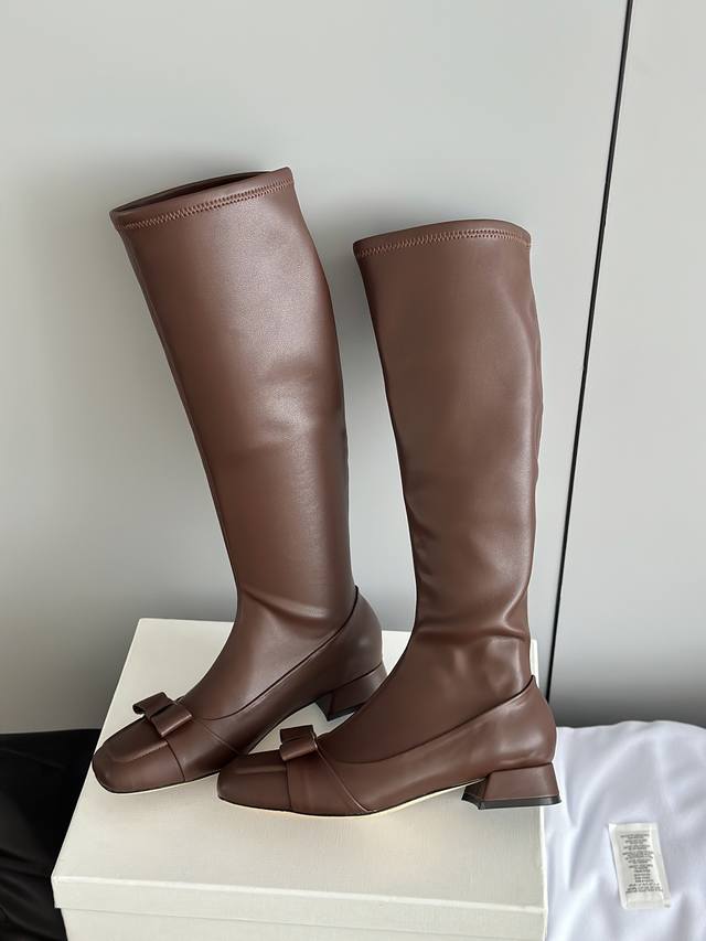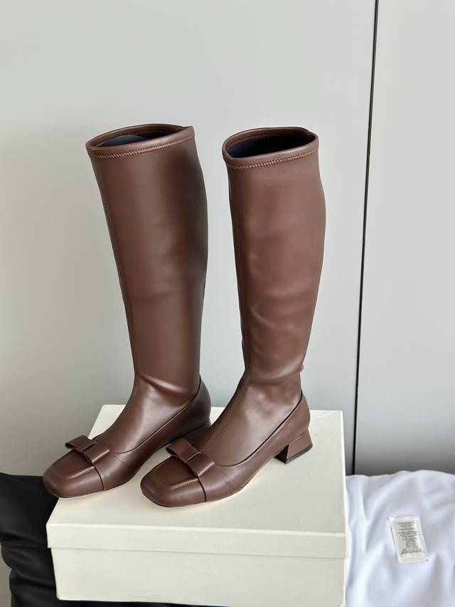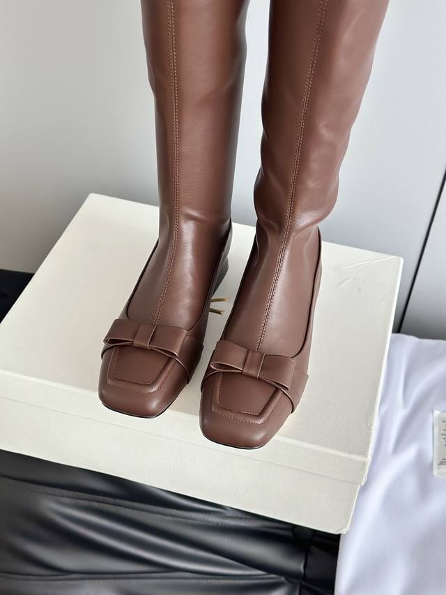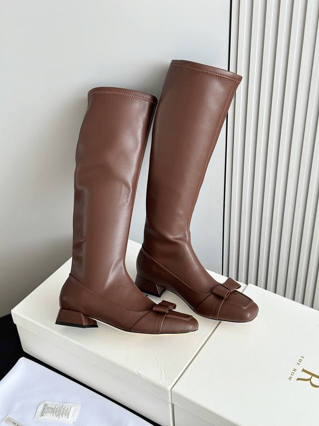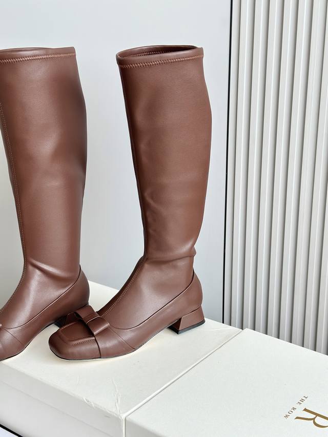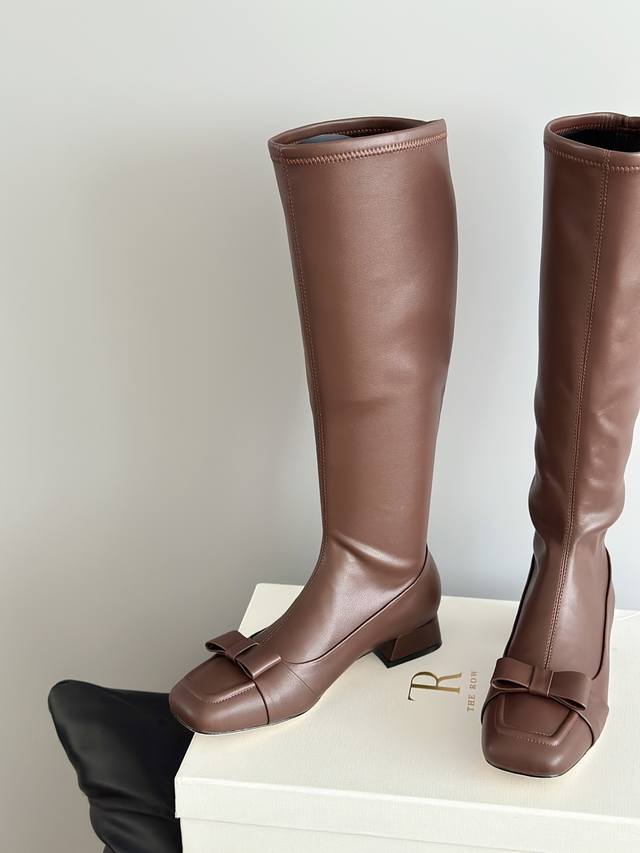 The Row25Ss复古方头蝴蝶结长靴长筒靴 延续品牌“极简奢华”的风格,靴型修长流畅,贴合腿部线条,视觉上极具延伸感,轻松打造“大长腿”效果。鞋头处装饰精致