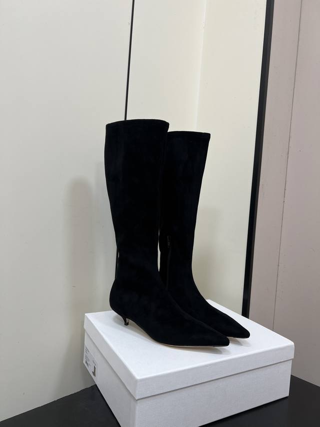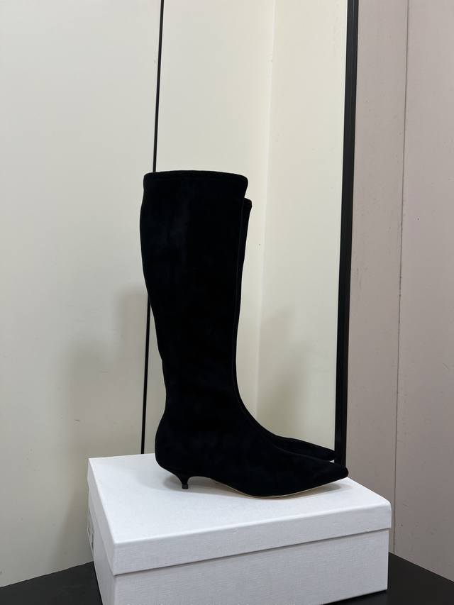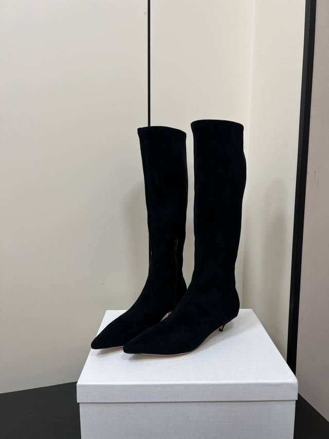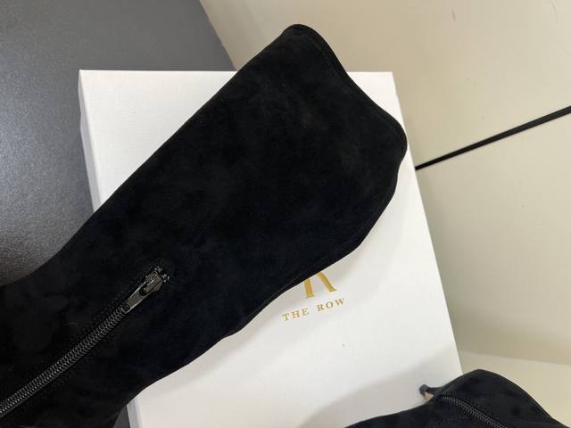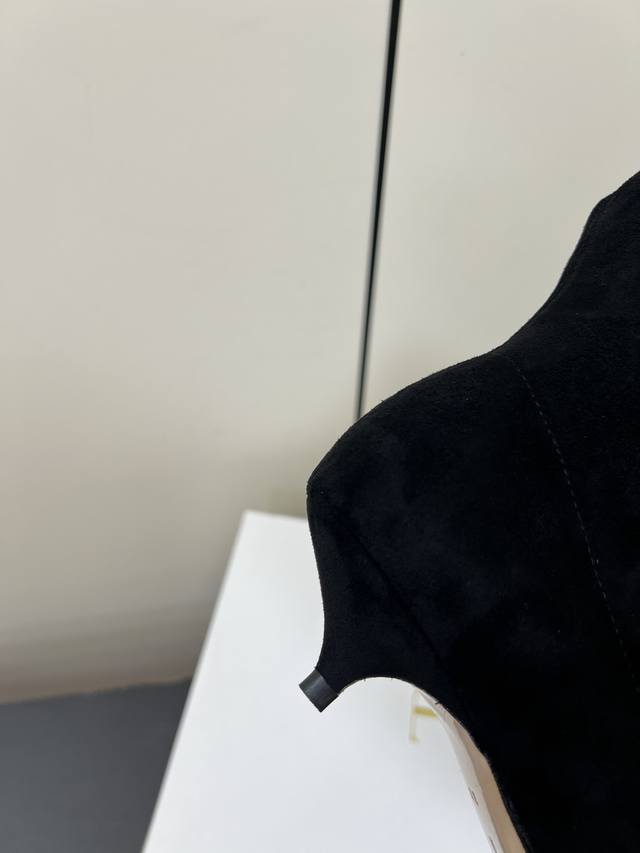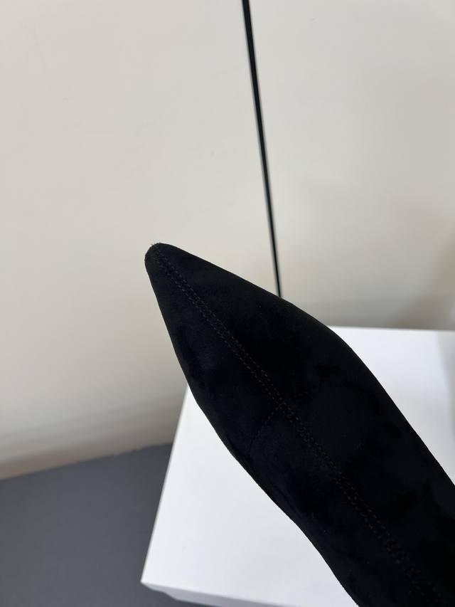 / Therow新款高跟弹力靴瘦瘦高筒靴 采用类似麂皮的材质,质感细腻。靴型是修身的短筒设计,侧边有拉链,方便穿脱,能很好地贴合脚踝线条。鞋头为尖头造型,增添了精致