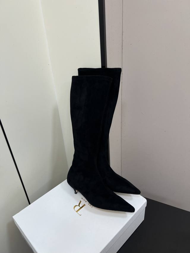 Therow新款高跟弹力靴瘦瘦高筒靴 采用类似麂皮的材质,质感细腻。靴型是修身的短筒设计,侧边有拉链,方便穿脱,能很好地贴合脚踝线条。鞋头为尖头造型,增添了精致感;搭配细跟设计,提升了整体的优雅度与女性魅力。 可搭配黑色紧身裤或皮质半裙,上身搭配西装外套,打造干练的职场风;也能与黑色丝绒连衣裙搭配,展现复古优雅的晚宴风格。 鞋面:羊猄弹力绒 内里:羊皮 大底:真皮大底 Size:35-40 40定制不退换