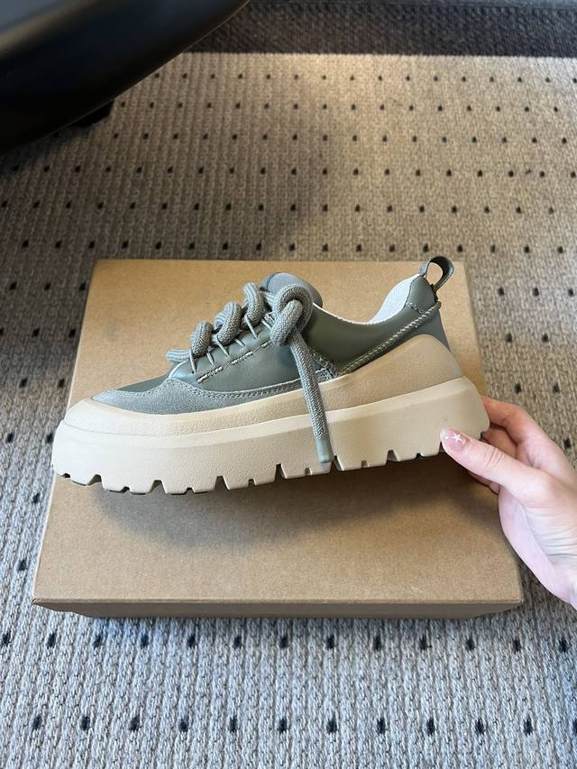 / Ug*秋季男女同款潮流轻便厚底系带运动休闲鞋 鞋面采用皮革和反绒皮拼接设计,质感细腻且耐穿;内里填充毛绒材质,延续Ugg标志性的保暖特性,适合秋冬寒冷天气。 选