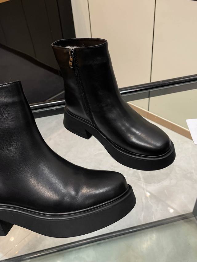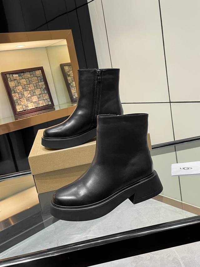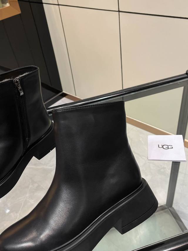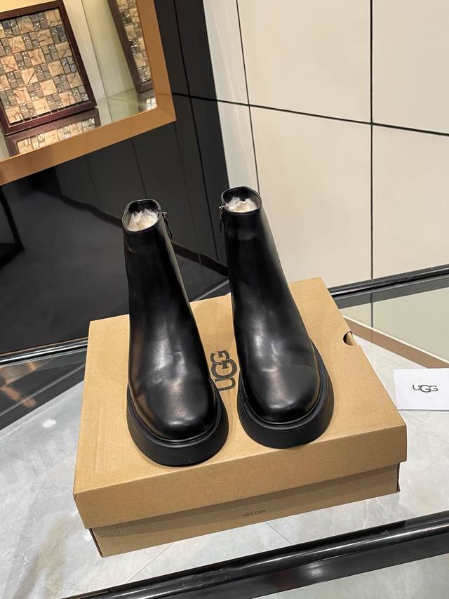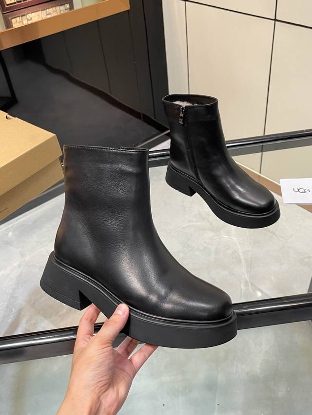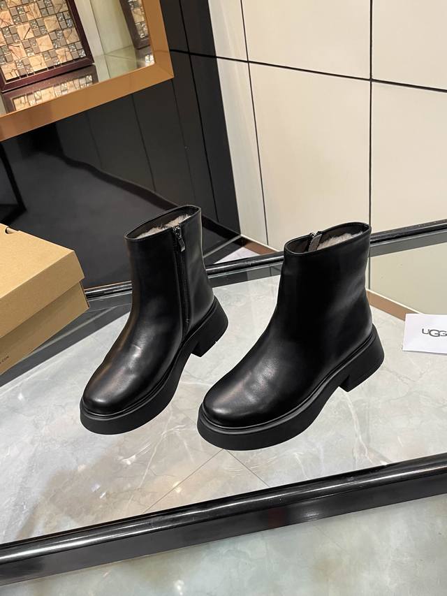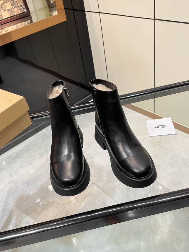 Ugg羊毛短靴 专柜最新款,官网还为更新, 休闲时尚百搭短靴。 面料 :黑色打腊牛皮. 黑色磨砂 内里 :纯澳洲进口皮毛一体百分之百的全羊毛 款式 :专柜新品.
