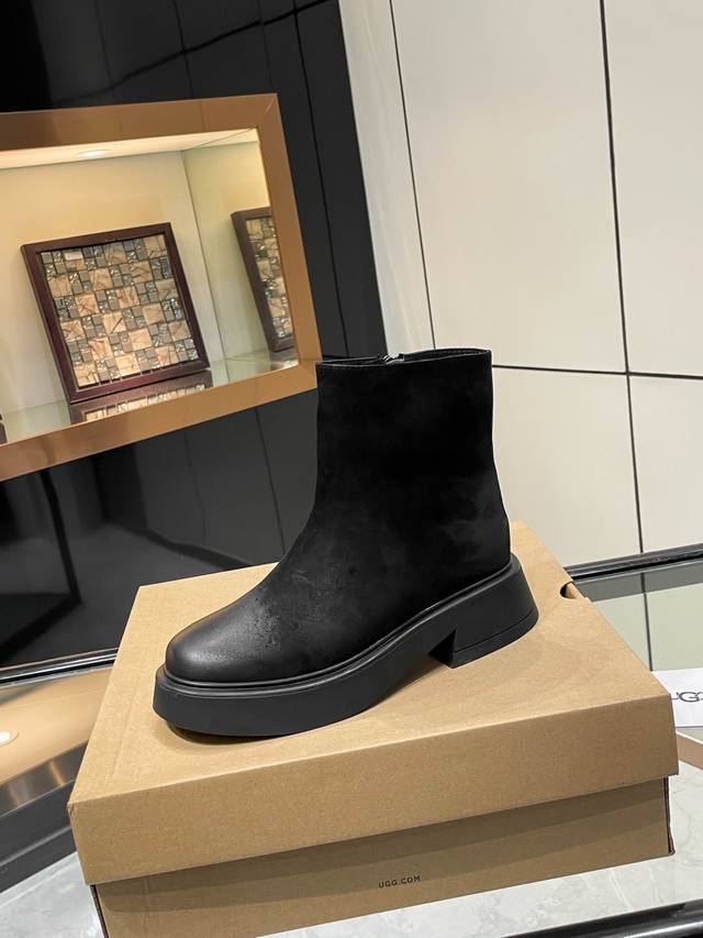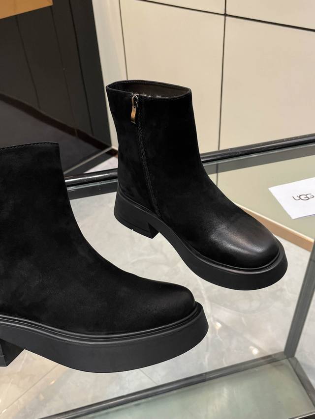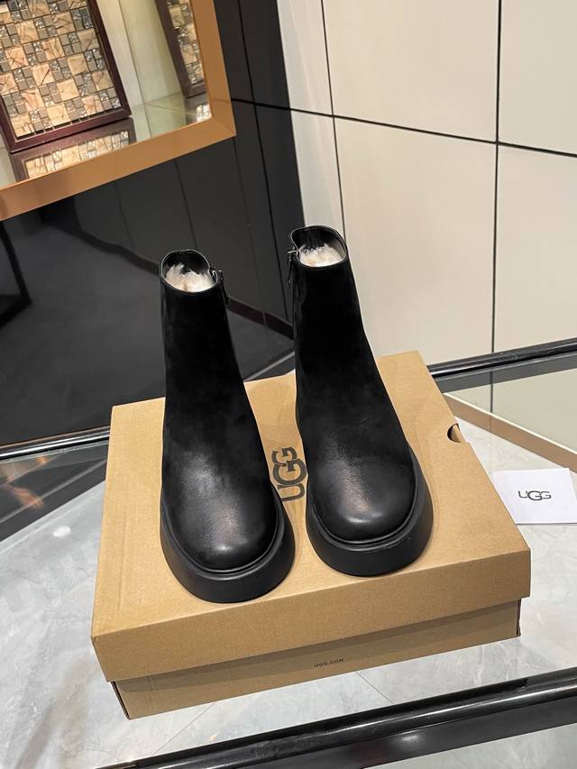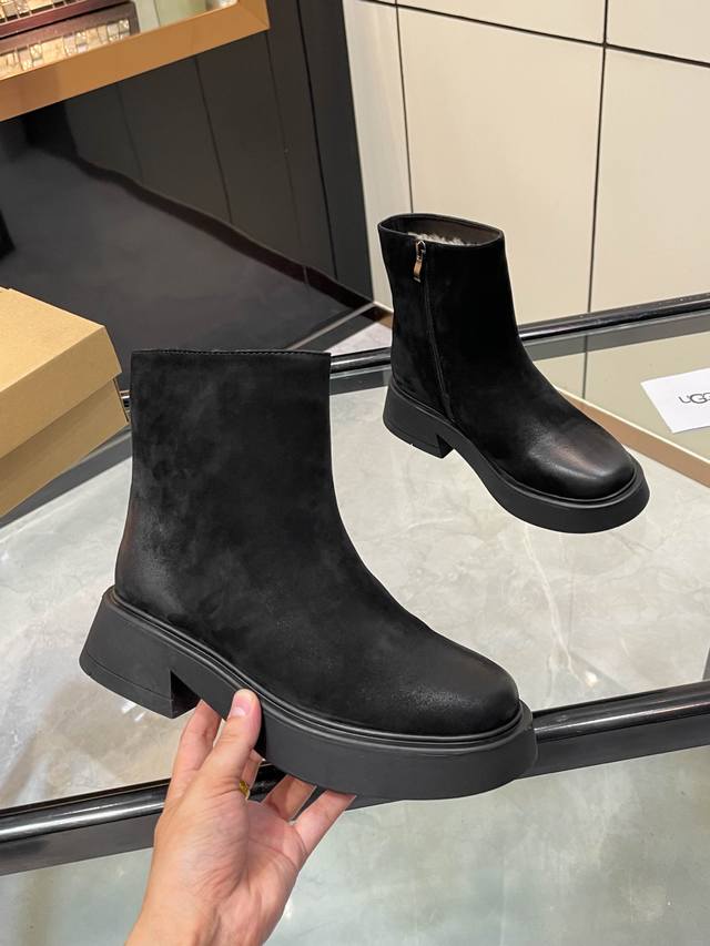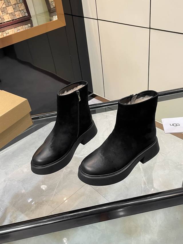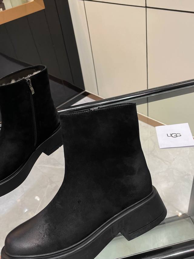 Ugg羊毛短靴 专柜最新款,官网还为更新, 休闲时尚百搭短靴。 面料 :黑色打腊牛皮. 黑色磨砂 内里 :纯澳洲进口皮毛一体百分之百的全羊毛 款式 :专柜新品.