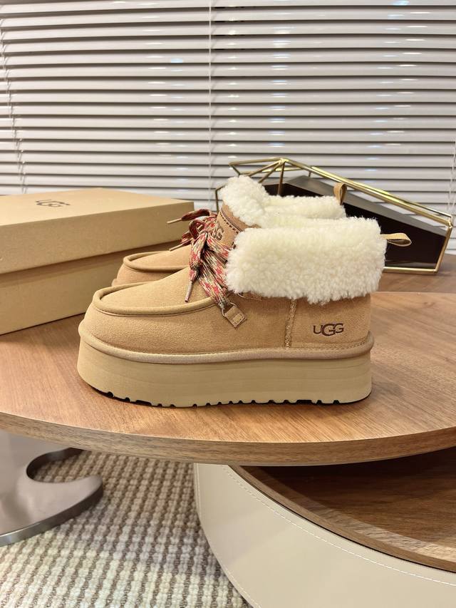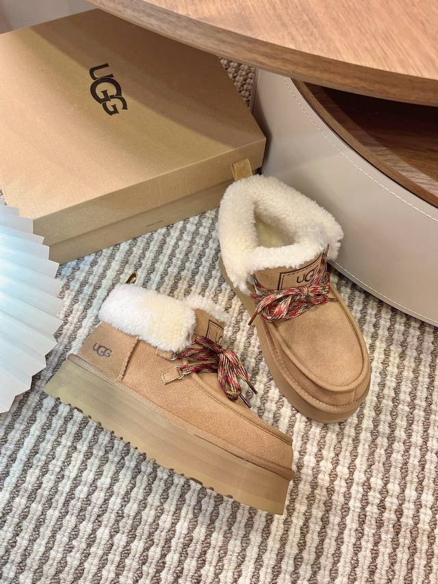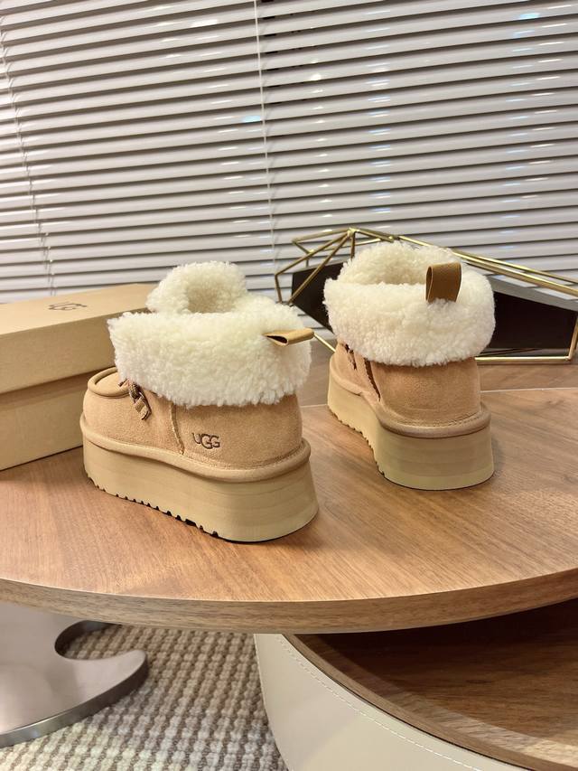 Ugg芙卡拉毛毛鞋雪地靴毛毛鞋 芙卡拉系带便鞋 厚底款 波纹羊毛固定翻边鞋圈口10毫米波纹羊毛里衬和内底厚底跟高4Cm,Eva外底 冬季和羊毛针织裤搭起来更显腿长 款号1143954 码数:35-40