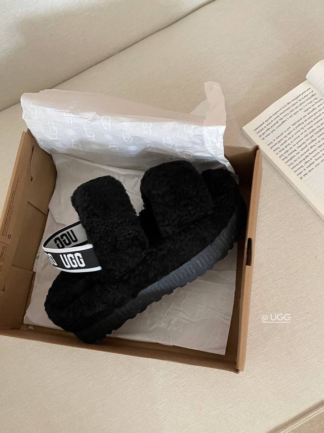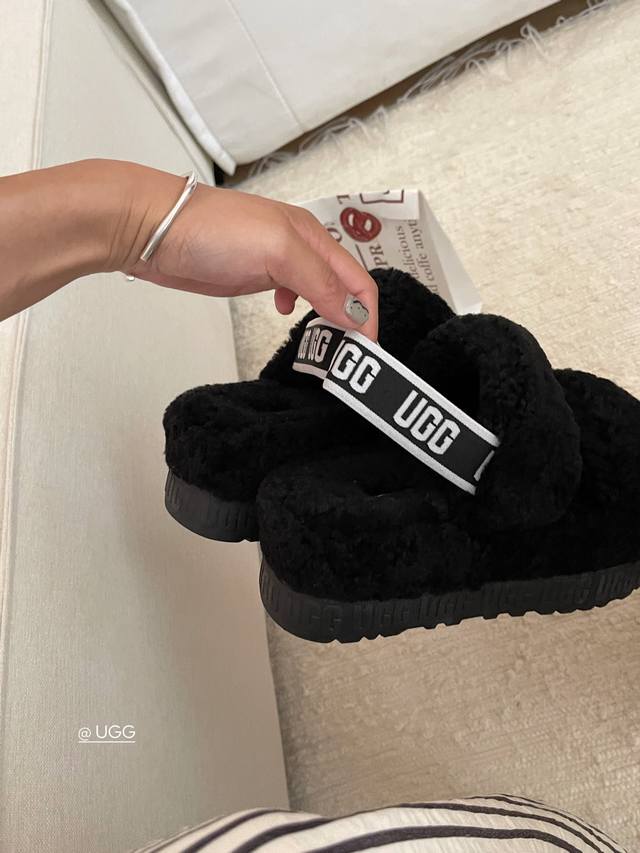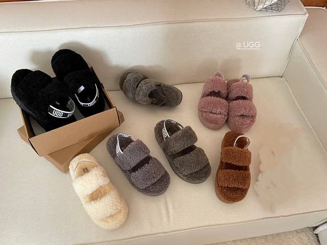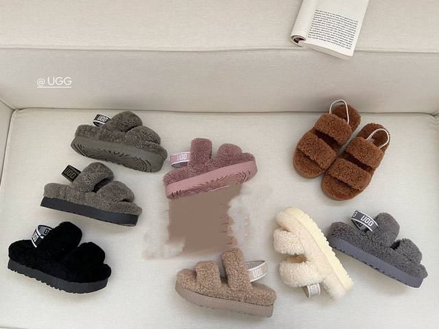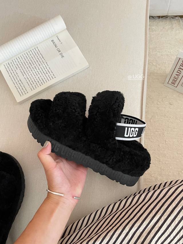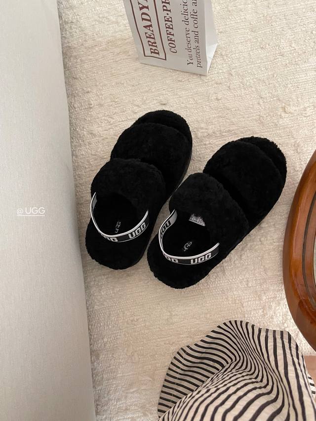 / Ugg 秋冬周冬雨同款毛茸拖 品名:欧芙拉菲塔, 隆丰泰迪毛松糕底拖 它是经典款Oh Yeah凉鞋的升级版,选用波纹羊皮毛材质更潮酷,后跟绑带是整个设计的亮点