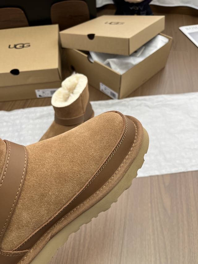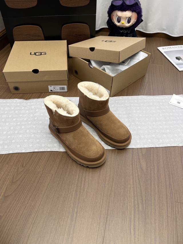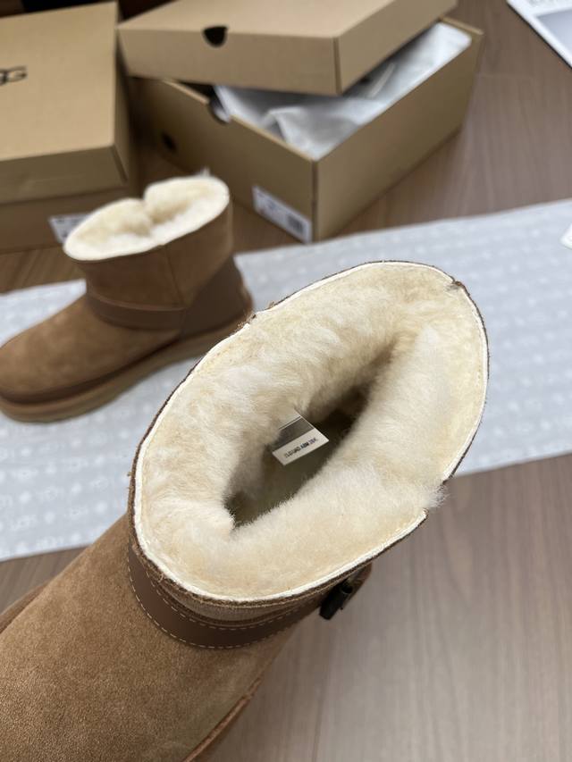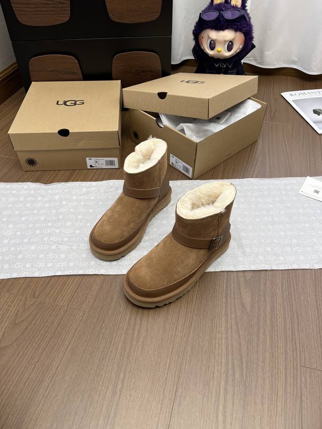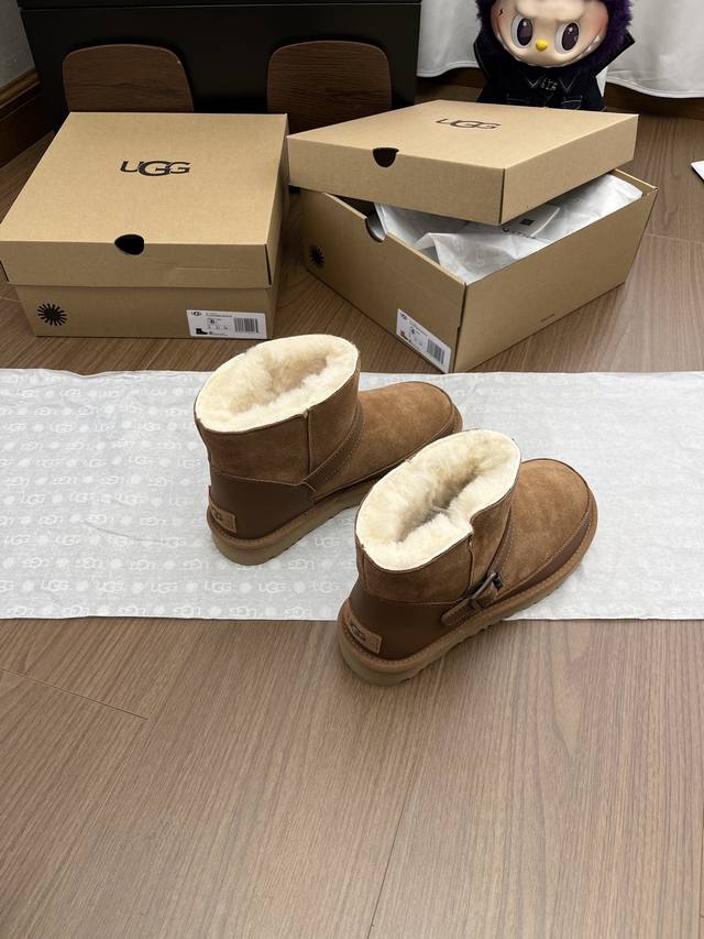 Ugg 蓓琳娜搭扣系列重磅来袭,从材质到版型全是顶配,秋冬氛围感直接拉满! DDD 一眼沦陷的奢级质感,藏在细节里 鞋面封神级用料,牛翻毛主面自带复古肌理,拼接耐磨牛皮挡泥板,雨天踩水、日常蹭脏都不怕,锁边缝线像精致刺绣般工整,每一针都是大牌工艺缩影。 DDD 可盐可甜双穿法,靴筒轻轻一翻,瞬间切换利落短靴与毛绒边饰款,搭配可调节金属搭扣,瘦脚宽脚都能贴肤适配,比普通雪地靴多了三分时髦小心机。 DDD 内里是行走的暖炉,隆丰羊皮毛一体可不是噱头!作为 Ugg 合作工厂p、全球羊裘皮龙头企业,隆丰的澳洲美利
