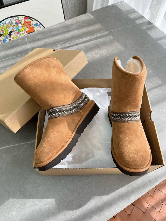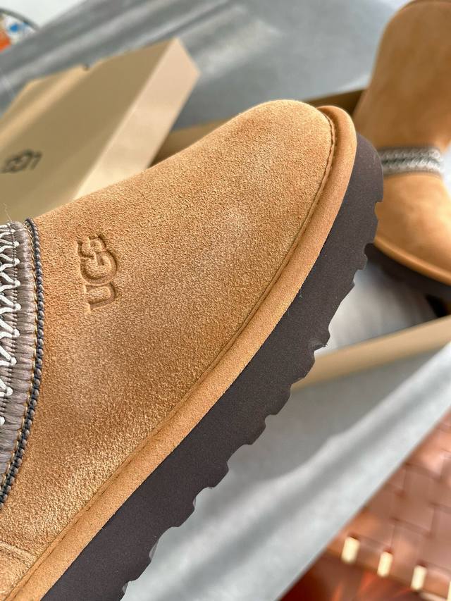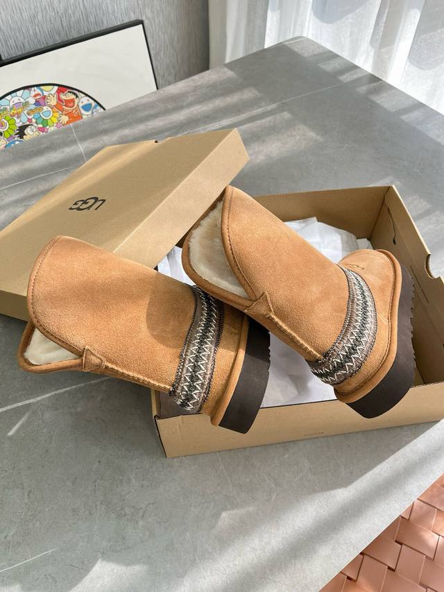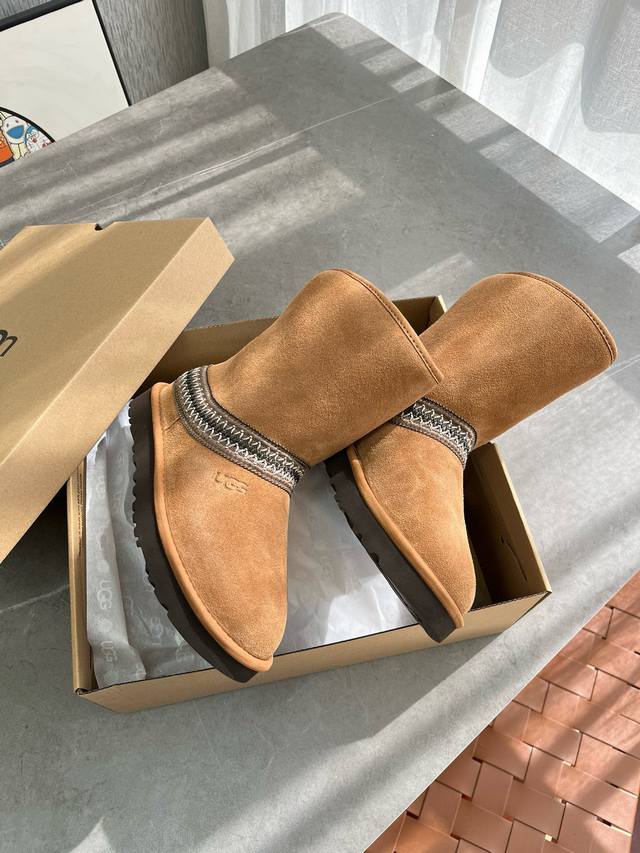 Ugg 雪地靴 秋冬新款经典短靴 新月系列雪地靴! DDD 复古风尚,温暖奢华 DDD 鞋面精选牛翻毛材质,匠心独运,穿着时不易出现折褶现象,告别传统短靴易出现折褶的尴尬,上脚整洁大方使双足倍感舒适。搭配独特的民族风编织元素,为简约设计增添一抹灵动色彩,不失个性。17毫米剪裁羊皮毛一体内里,温暖触感细腻柔软,为寒冷天气提供至臻呵护。功能与美感的完美融合 DDD 精美翻毛皮包边,不仅勾勒出奢华轮廓,更是耐久品质的象征。细腻的触感与奢侈的用料相得益彰!轻盈灵动的Eva大底是该款短靴的重要特色,具备优异的回弹性
