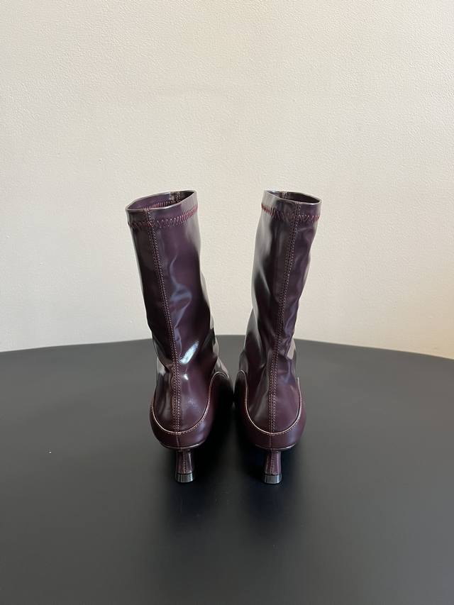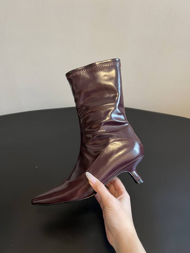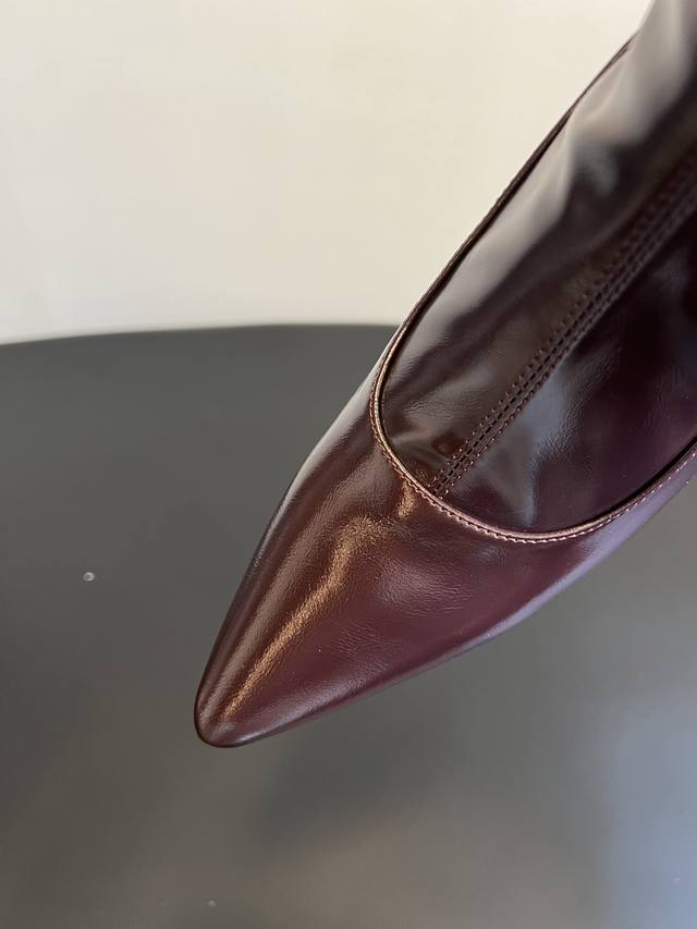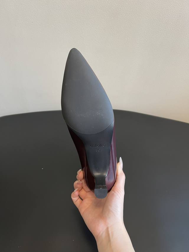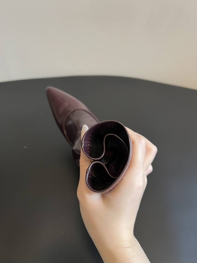 Unfoli*新款亮面皮革尖头高跟长筒靴 短靴 DDD 尖头高跟设计,分为长筒靴与中筒靴两种长度,靴筒采用微宽松的直筒 微阔型剪裁,线条利落且带有修饰腿型的效果,鞋跟为细高跟,提升了整体精致度。 DDD 选用亮面皮革,表面带有细腻的光泽感,触感顺滑,同时中筒款加入了弹性拼接设计,兼顾贴合度与舒适度。以经典黑色和复古酒红色为主,两种配色都是秋冬的百搭色系,酒红色增添了复古优雅的氛围,黑色则更显酷飒简约。 DDD 鞋面:牛油皮 Ddd 内里:羊皮 Ddd 大底:橡胶大底 Ddd 增高:6Cm Ddd Size