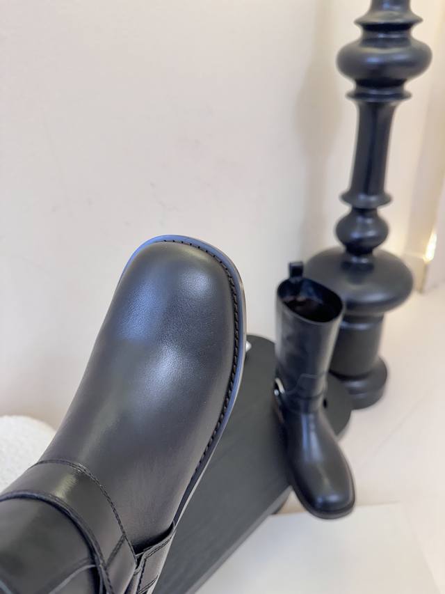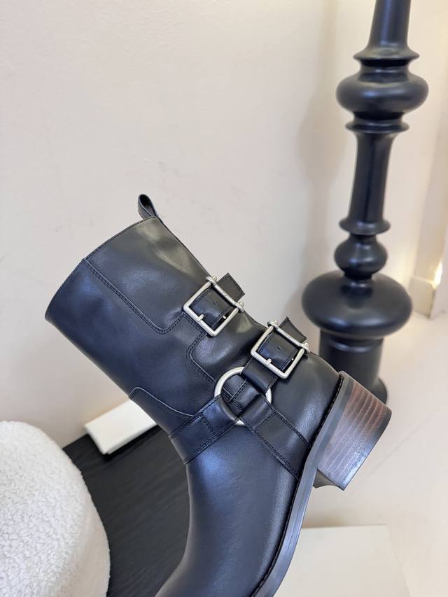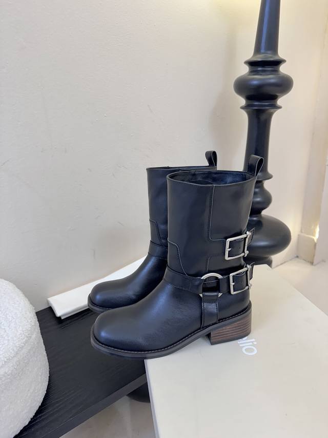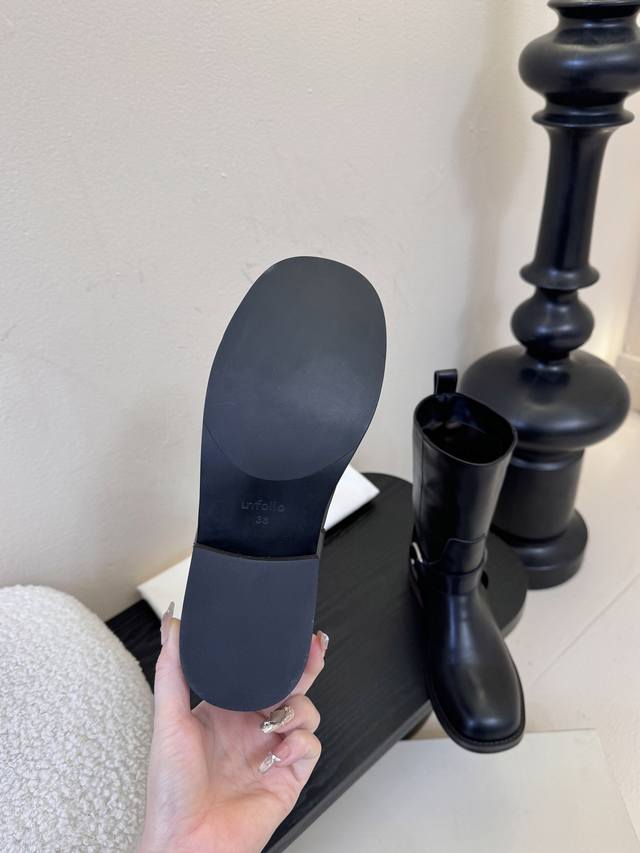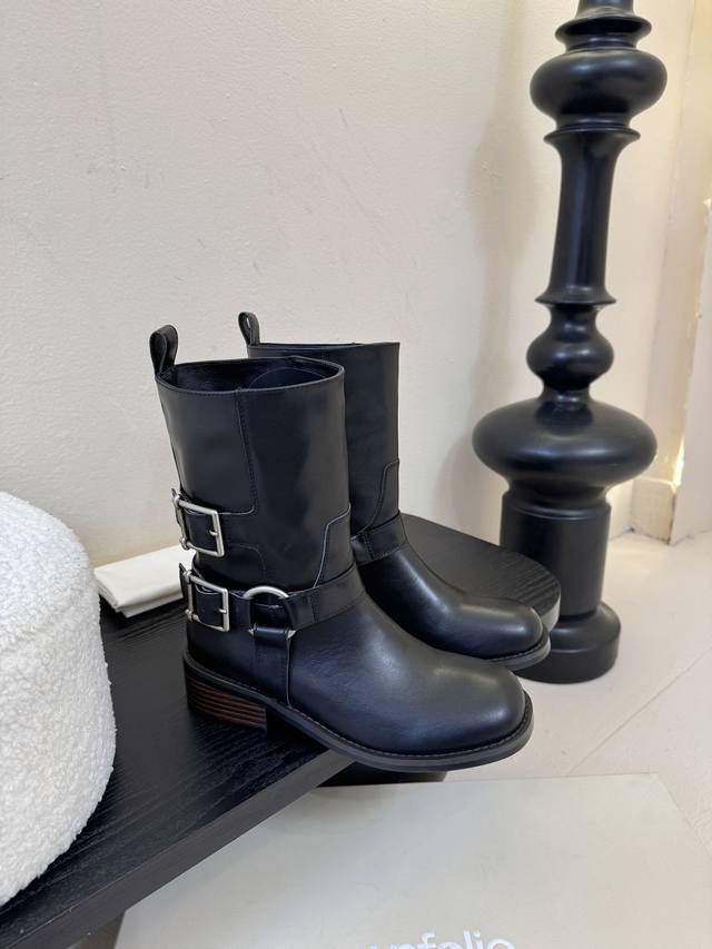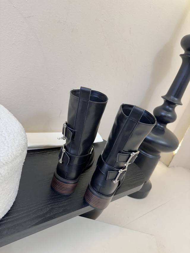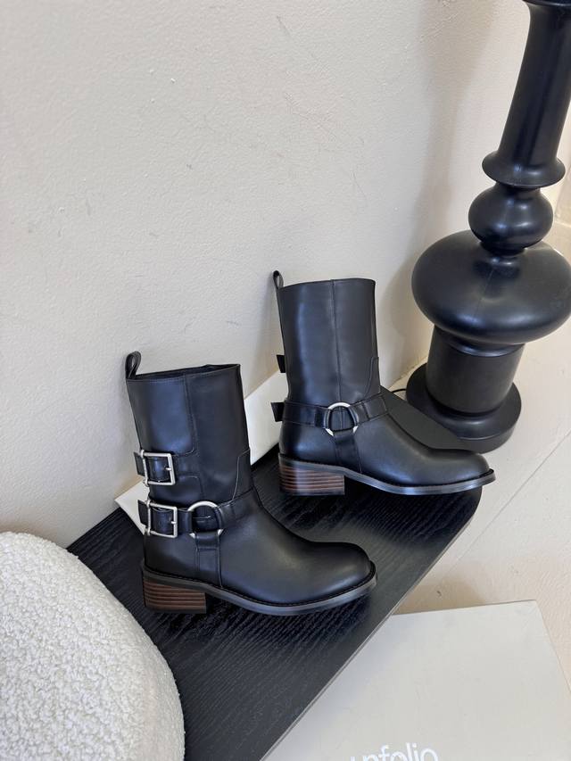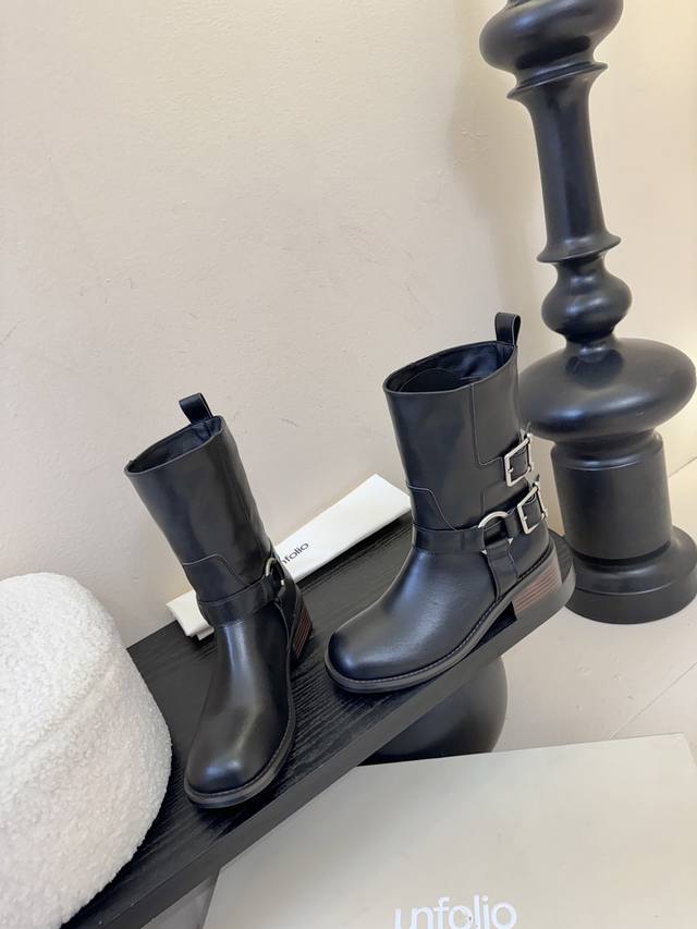 Unfoli* 25Ss 秋冬新款金属搭扣西部牛仔靴 DDD 有光泽感的皮革材质和做旧质感的绒面材质,不同材质呈现出不同的风格质感,皮革款显得硬朗挺括,绒面款则多了几分复古做旧的韵味。带有金属扣带设计,增加了工装风、机车风的元素,让靴子更具个性与设计感,金属扣的光泽也提升了整体的精致度。 DDD 中筒靴型,能够修饰腿部线条;鞋头为圆头设计,穿着舒适且具有复古感;鞋跟为低跟设计,兼顾了时尚与日常行走的实用性。整体复古工装、机车风,同时又具备日常穿搭的实用性,适合打造酷帅、复古或中性风的造型。 DDD 鞋面: