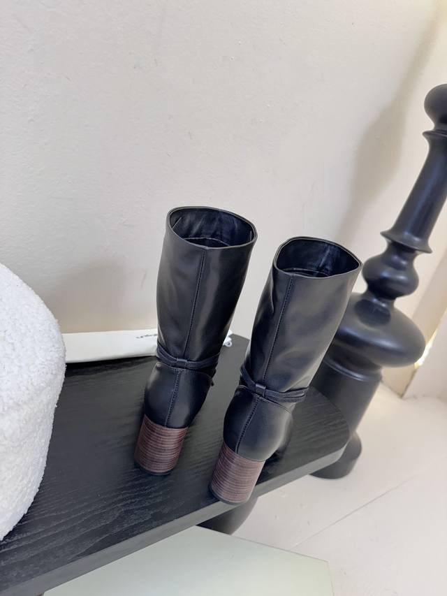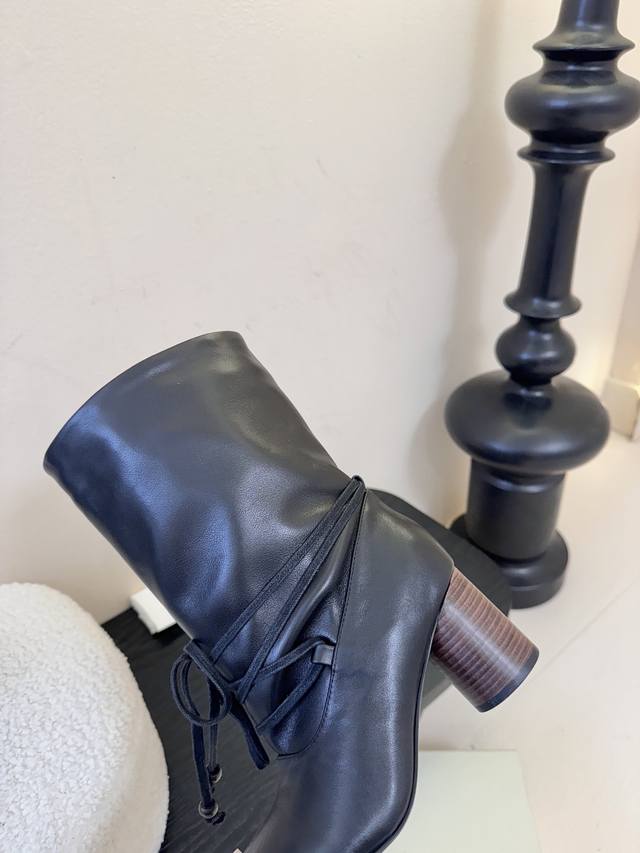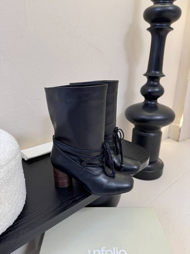 Unfolio 秋冬新品 Unfolio褶皱绑带靴|把“暗黑高级感”焊在秋冬穿搭里 柔滑皮革揉出随性褶皱 绑带设计锁住小众腔调 木质粗跟踩出复古气场 这双靴把暗