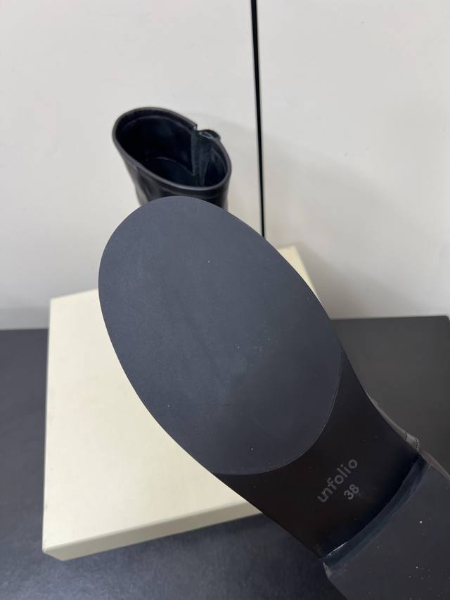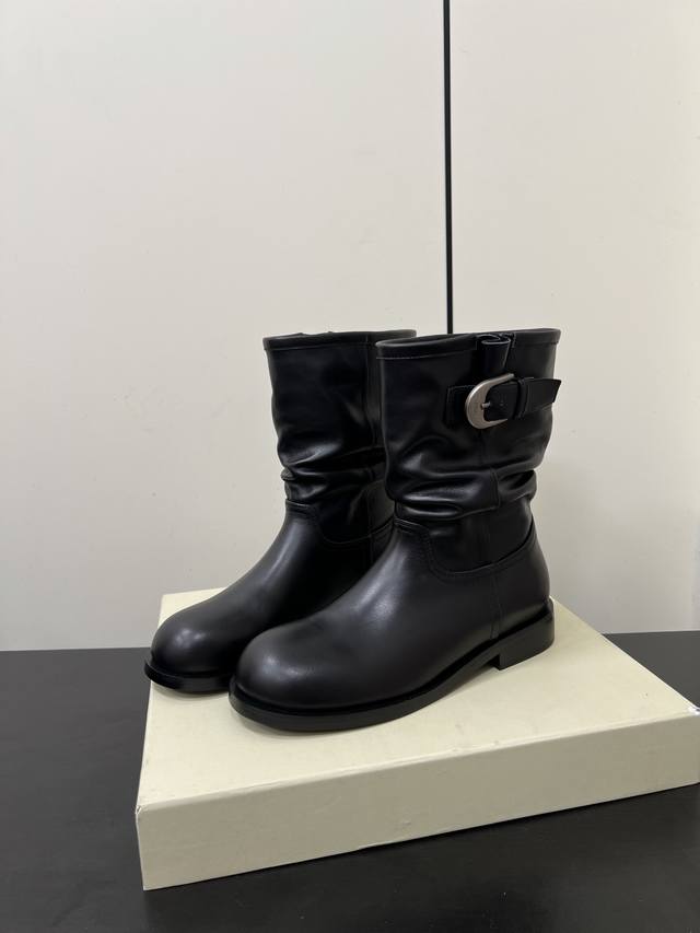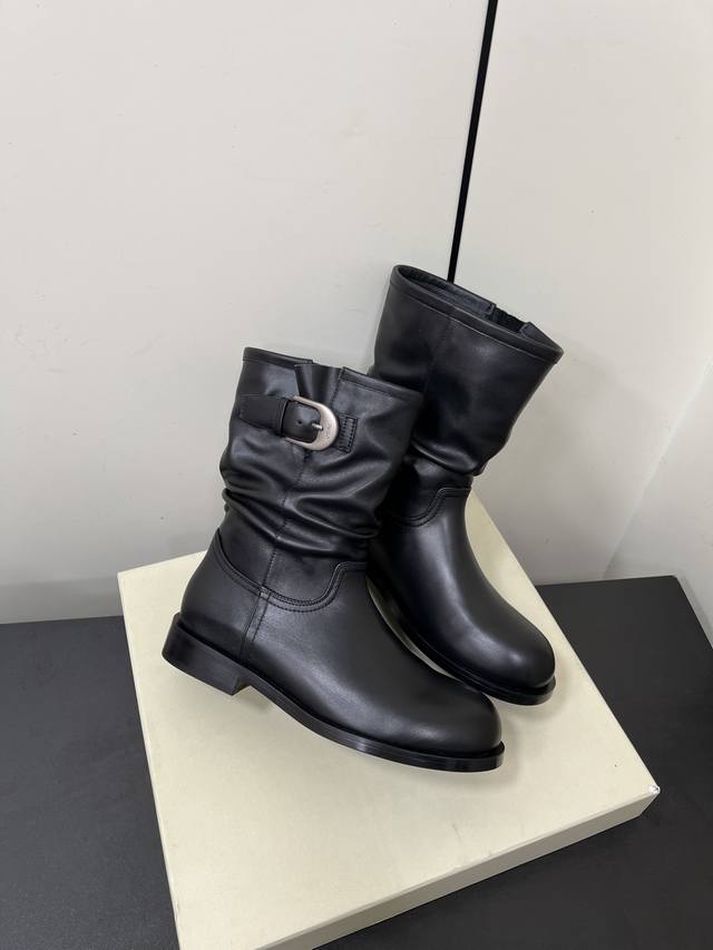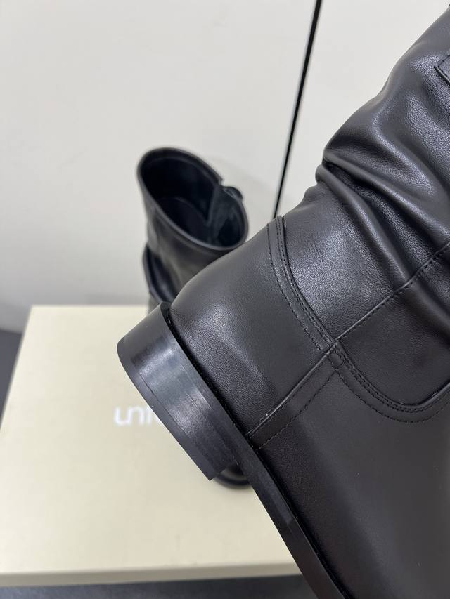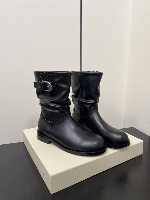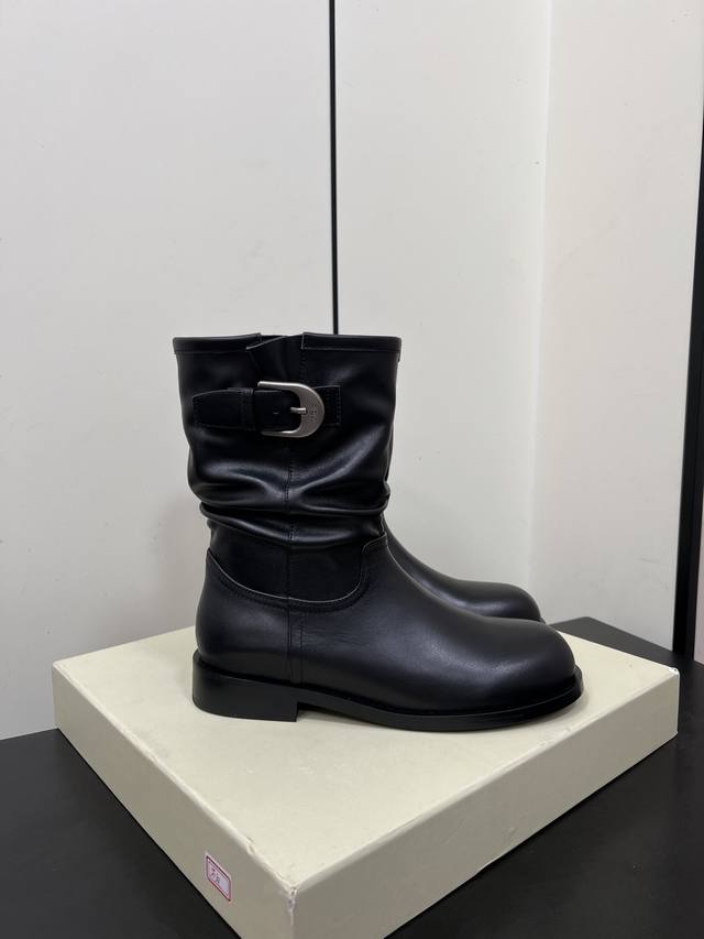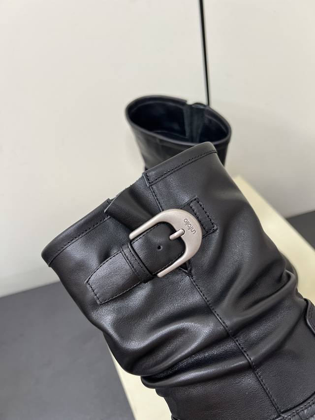Unfolio 25秋冬新款金属搭扣拼色堆堆靴 DDD 这款鞋灵感源于传统的工程师靴。其外观显著的特征是上下各配备一个可调节的金属针扣,此设计能够实现调节靴筒维度的功能。Unfolio 在保留其功能性的前提下,对这一元素予以精炼,让其装饰性更为凸显。堆堆靴的整个鞋面结构皆以此为蓝本,同时对版型进行了改良,使其更贴合女孩的穿着需要。 DDD 不同配色的鞋面分别采用光面质感的小牛皮、做旧表面质感的牛皮与翻毛皮拼接以及全翻毛皮作为鞋面,靴筒内里则选择细腻的弹力莱卡织物,材质顺滑流畅,入脚的一瞬,便能即刻感受到靴