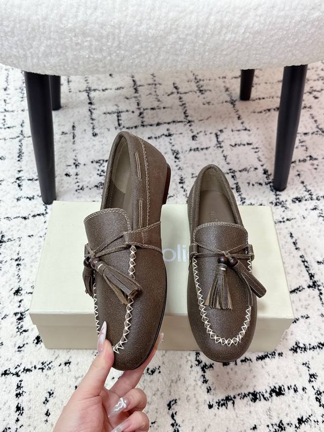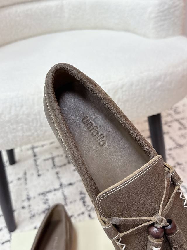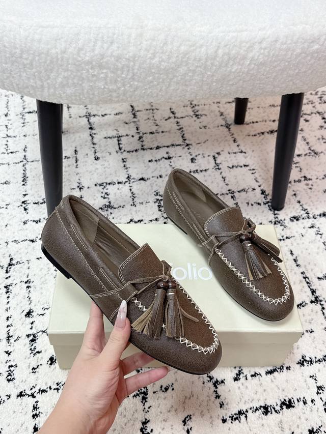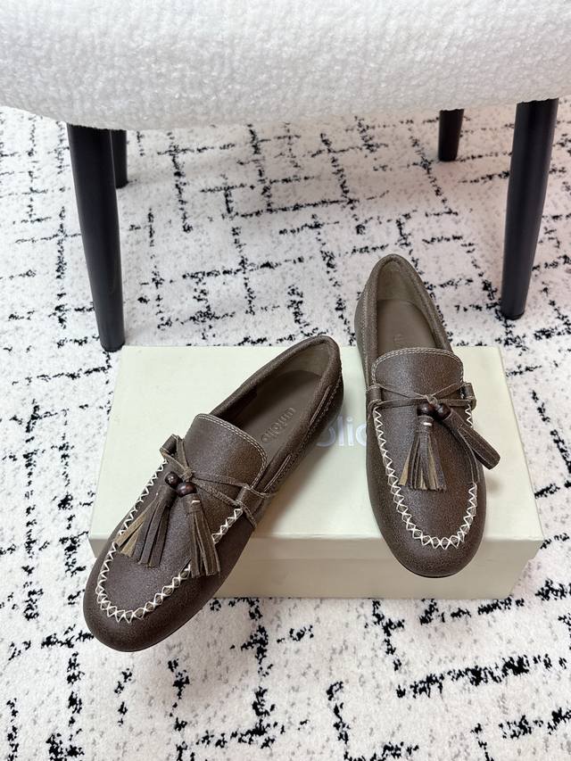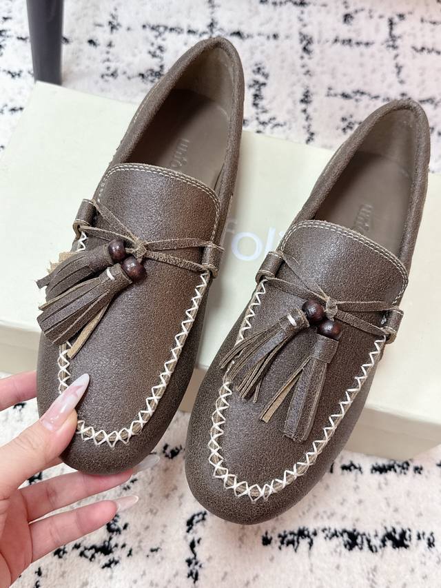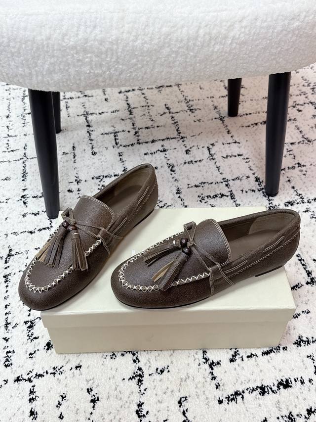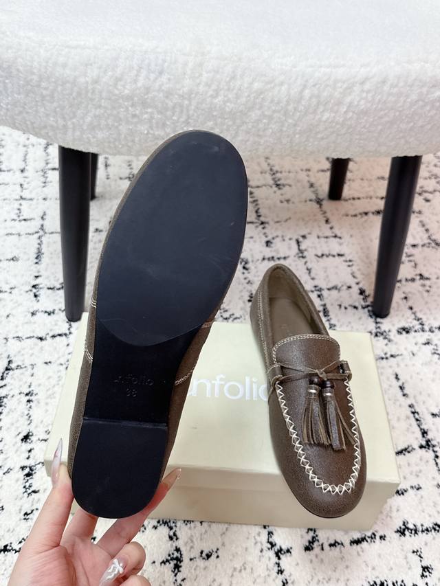 Unfolio 25 最新 复古简约流苏平底 乐福鞋 单鞋 DDD 麂皮材质,质感柔软且自带哑光高级感。设计有细节,鞋身带流苏、装饰珠和明线缝线,精致又有复古氛围。款式是套脚乐福鞋,穿脱方便,日常通勤或休闲场合都适配。 DDD 配色是低饱和的棕调色系,低调百搭,容易和不同风格的穿搭融合,鞋型贴合脚型,平底设计兼顾舒适与利落感。 DDD 鞋面:牛反绒 DDD 内里:羊皮 DDD 大底:橡胶大底 DDD 增高:2Cm DDD Size : #35-41码 40.41定制不退换 DDD
