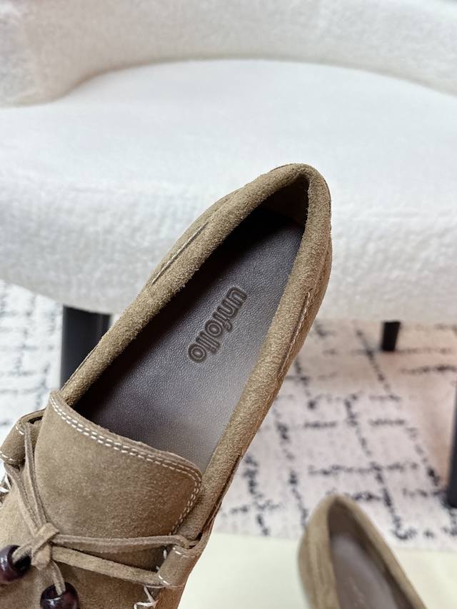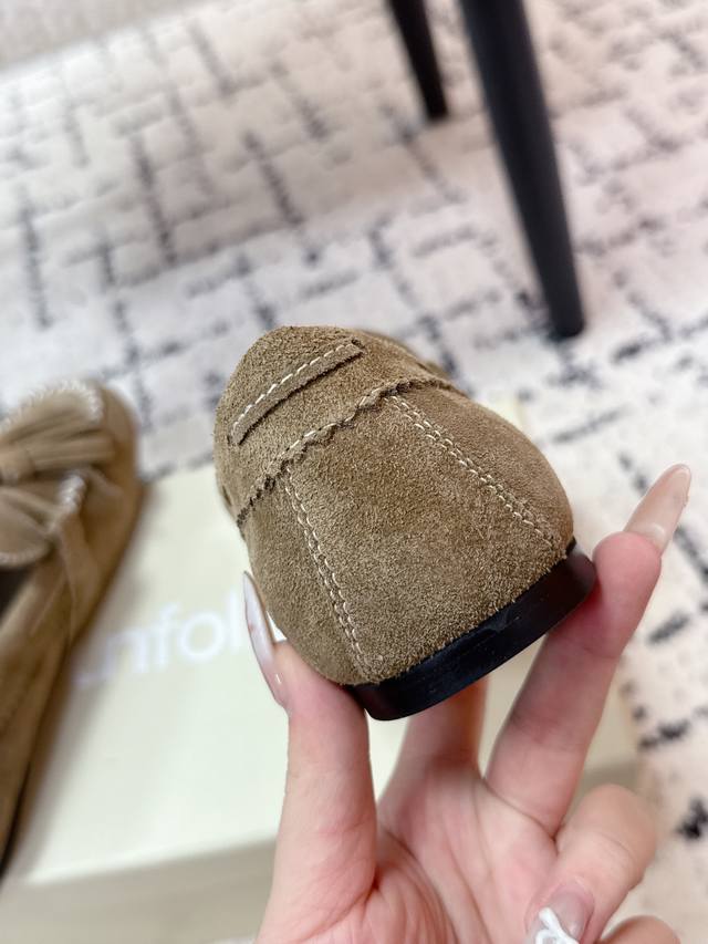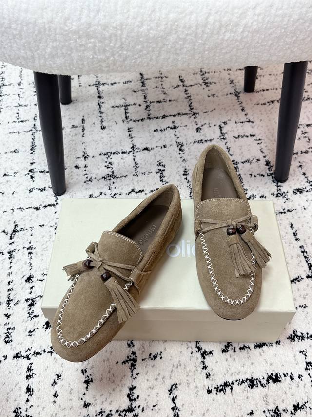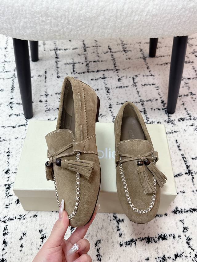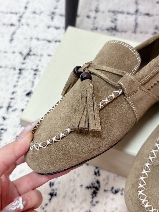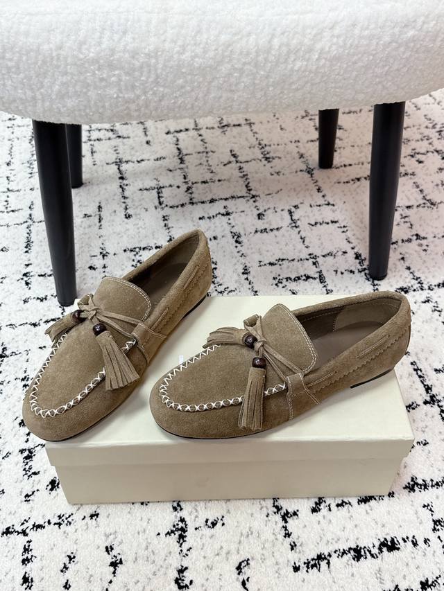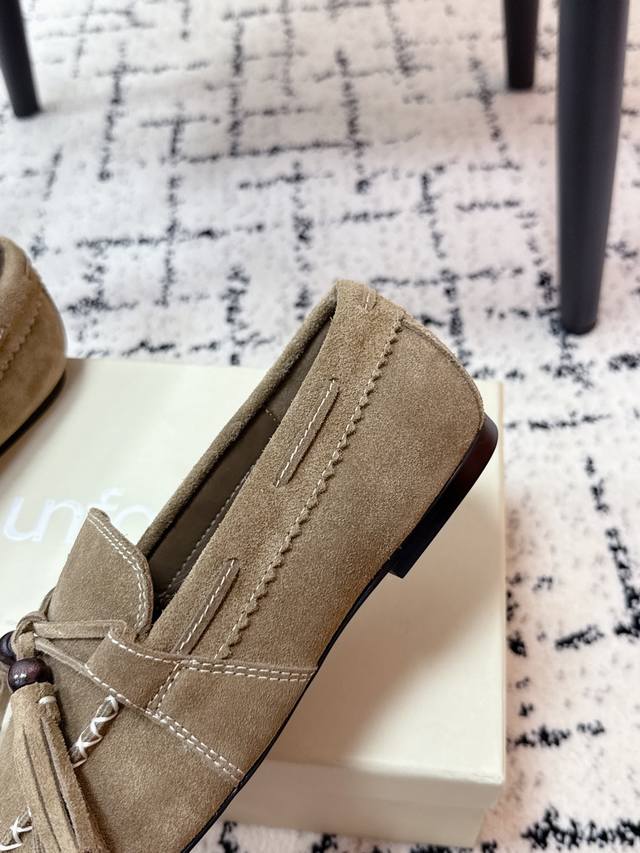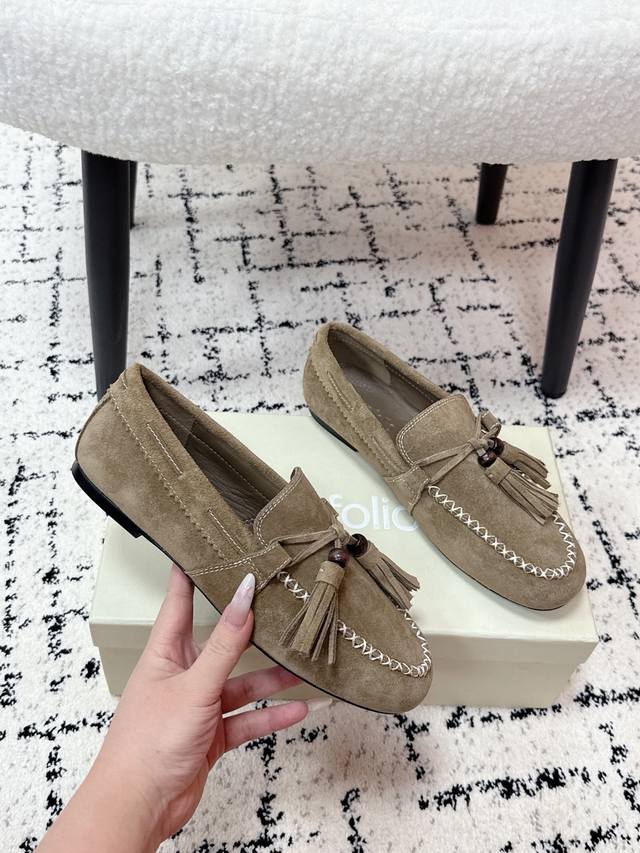 Unfolio 25 最新 复古简约流苏平底 乐福鞋 单鞋 DDD 麂皮材质,质感柔软且自带哑光高级感。设计有细节,鞋身带流苏、装饰珠和明线缝线,精致又有复古氛围。款式是套脚乐福鞋,穿脱方便,日常通勤或休闲场合都适配。 DDD 配色是低饱和的棕调色系,低调百搭,容易和不同风格的穿搭融合,鞋型贴合脚型,平底设计兼顾舒适与利落感。 DDD 鞋面:牛反绒 DDD 内里:羊皮 DDD 大底:橡胶大底 DDD 增高:2Cm DDD Size : #35-41码 40.41定制不退换 DDD