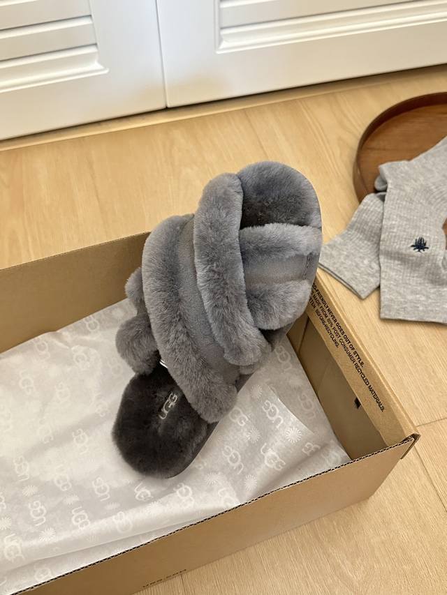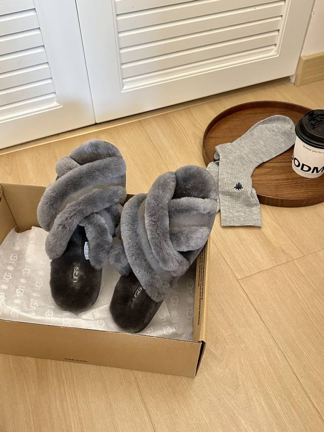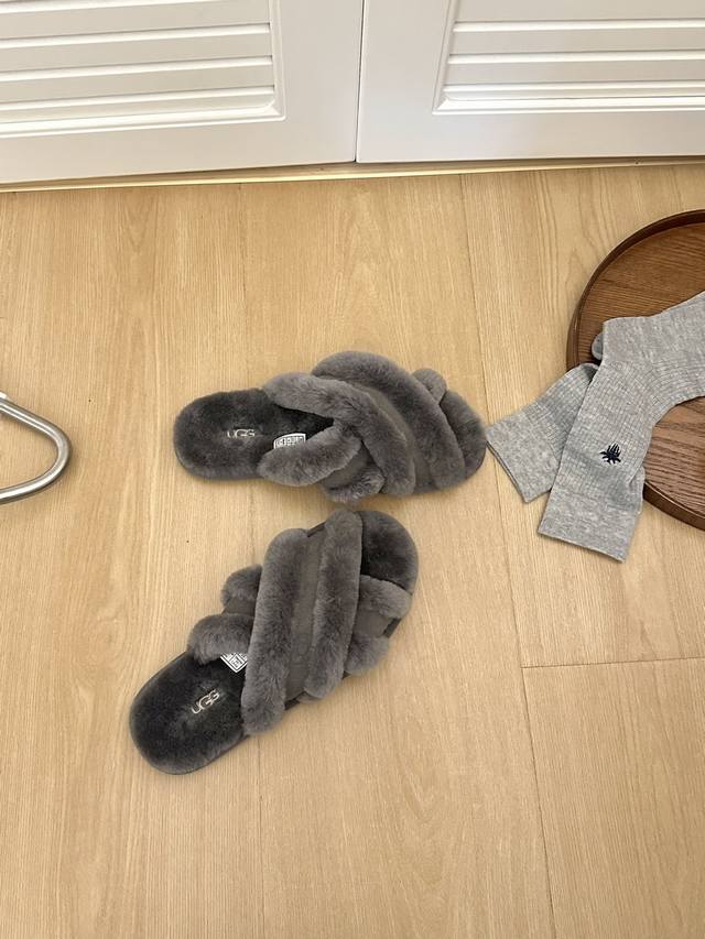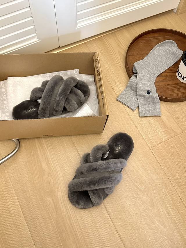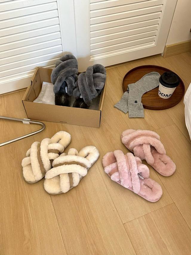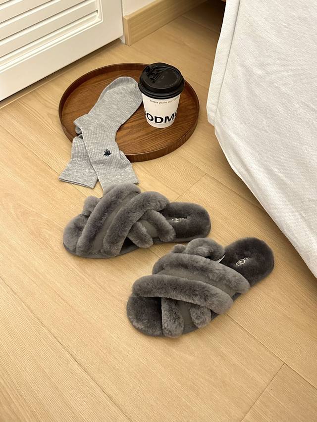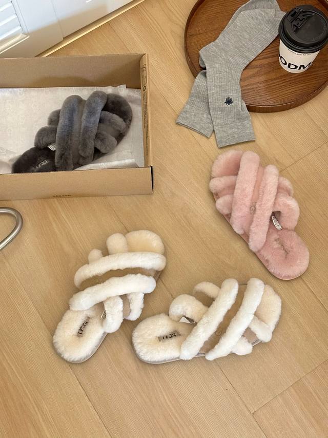 Uugg女士休闲露趾毛茸舒适居家凉拖鞋 #交叉拖 羊毛拖 鞋面羊毛、鞋底组合Eva橡胶防滑大底 Size:35-40