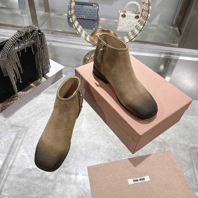 / 出厂价P 女装女鞋 运动原单 Miumiu 2025Ss秋冬新款圆头短靴 Miu系全球限量款靴子,今年最值得入手的靴子 重工艺手工鞋 复古擦色牛皮短靴 满满的复