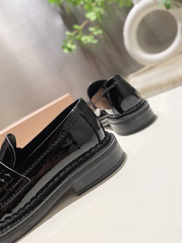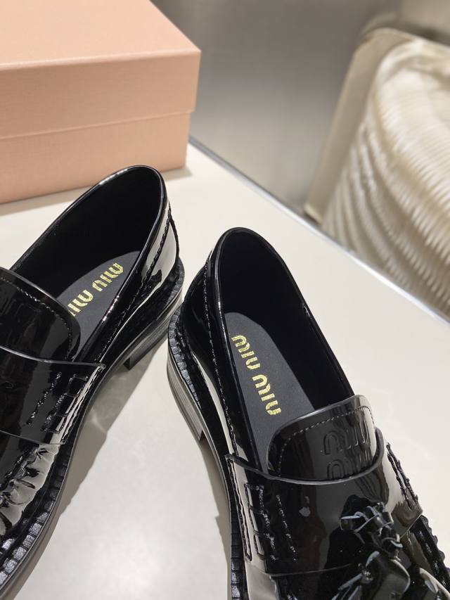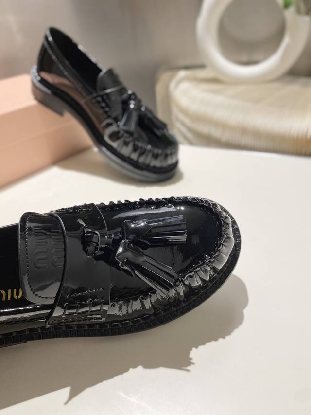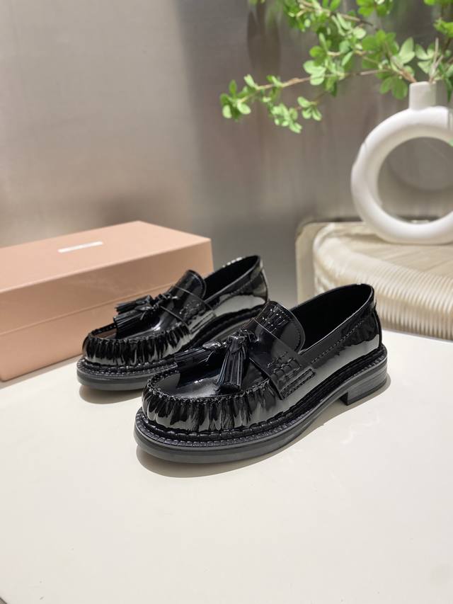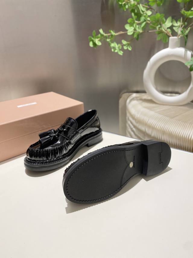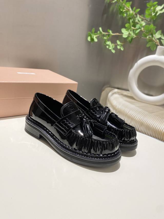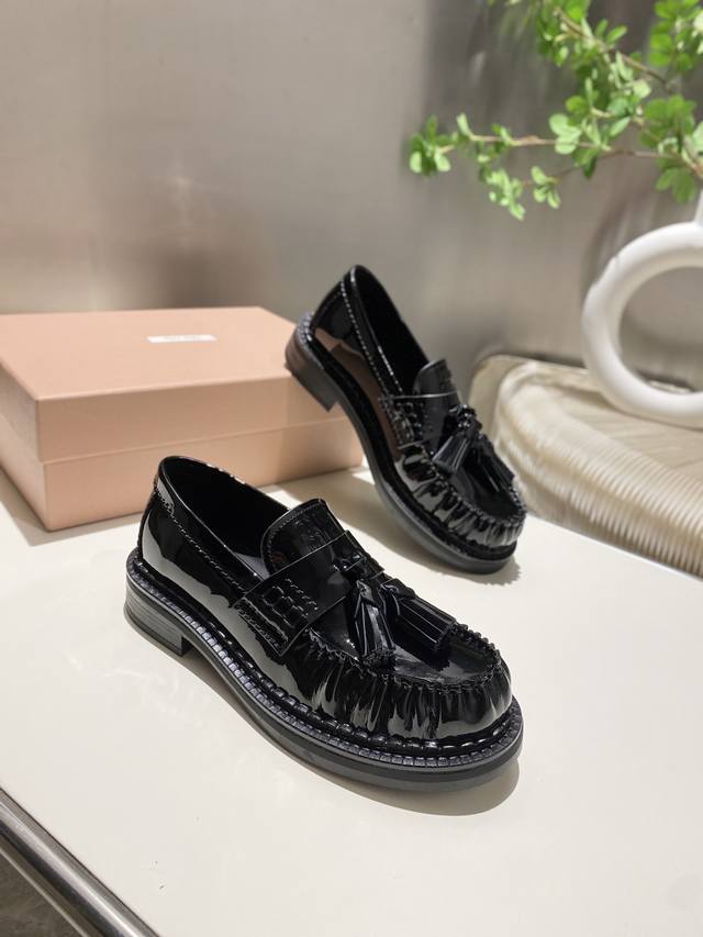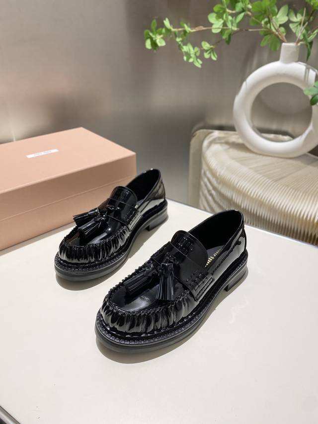 / 出厂价p 缪缪2025走秀新款 流苏饰机车鞋一脚蹬乐福鞋小皮鞋休闲鞋 这款永不过时的小牛皮乐福鞋,鞋舌部位饰有压花Miu徽标,彰显别具一格的经典格调。鞋头盖点缀