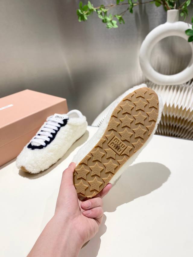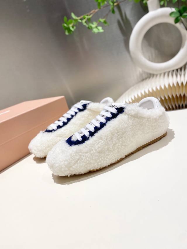 出厂价p 缪缪Miumiu2025新款 阿甘鞋 德训毛毛鞋 复古时尚 简约高级 随意搭配 上脚非常轻便舒适,鞋面原高丝光牛反绒羊高毛拼接. 内里羊皮,原板大底一