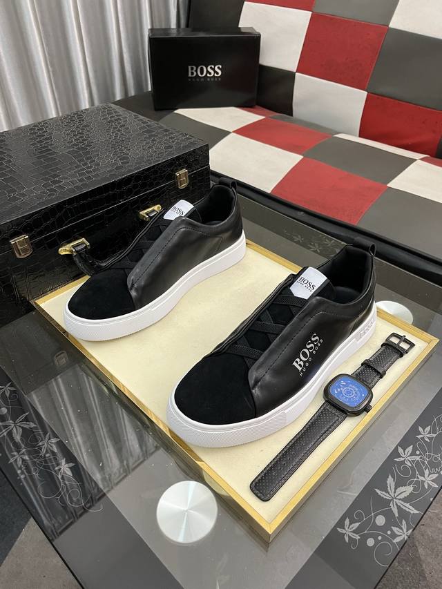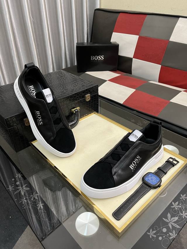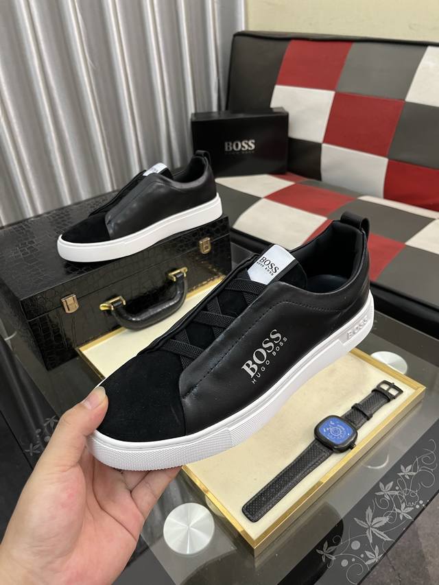 / 出厂价Pp: Boss 最新休闲男鞋,欢迎1:1对比,爆单款Boss香港专柜休闲鞋,专柜品质,支持验货,优质做工,鞋面采用意大利进口胎牛皮拼接布料进口透气羊皮内