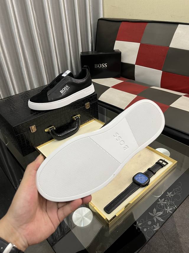 出厂价Pp: Boss 最新休闲男鞋,欢迎1:1对比,爆单款Boss香港专柜休闲鞋,专柜品质,支持验货,优质做工,鞋面采用意大利进口胎牛皮拼接布料进口透气羊皮内