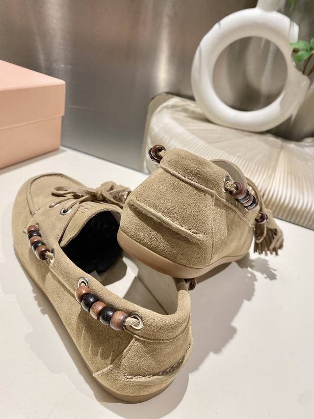 出厂单鞋 托鞋330缪缪2025擦色系带鸡眼平底豆豆鞋 流苏走秀新款 .复古小皮鞋乐福鞋 豆豆鞋 复古时尚 简约高级 随意搭配 上脚非常舒适,年度必入款!超级重