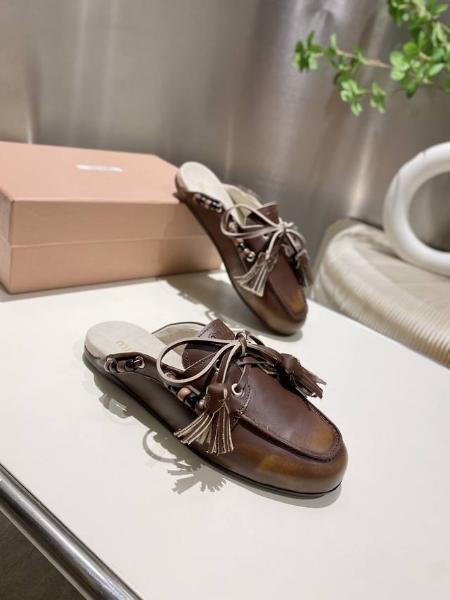 出厂单鞋 托鞋330缪缪2025擦色系带鸡眼平底豆豆鞋 流苏走秀新款 .复古小皮鞋乐福鞋 豆豆鞋 复古时尚 简约高级 随意搭配 上脚非常舒适,年度必入款!超级重工 每一双都是独一无二的擦色 ,鞋面原版做旧牛皮 内里羊里 ,原版大底 34-41码 34.40.41定制 DDD