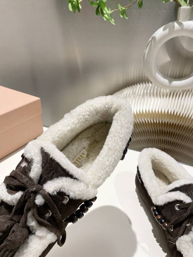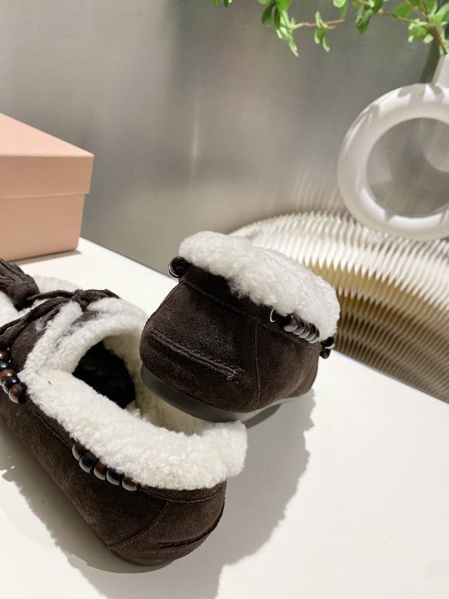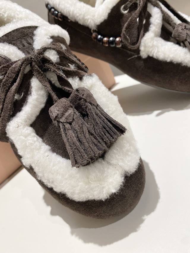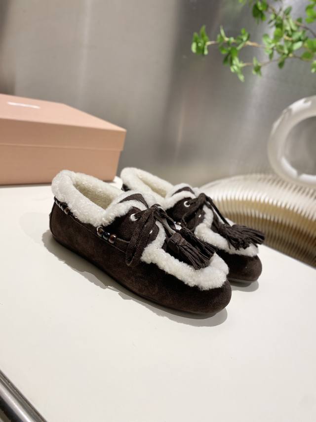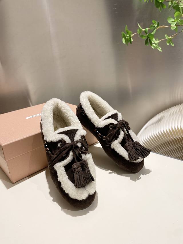 出厂单鞋 缪缪2025平底豆豆鞋毛毛鞋,流苏走秀新款 .复古乐福鞋 ,复古时尚 简约高级 随意搭配 上脚非常舒适,年度必入款!,鞋面原版牛反绒,内里羊毛 ,原版