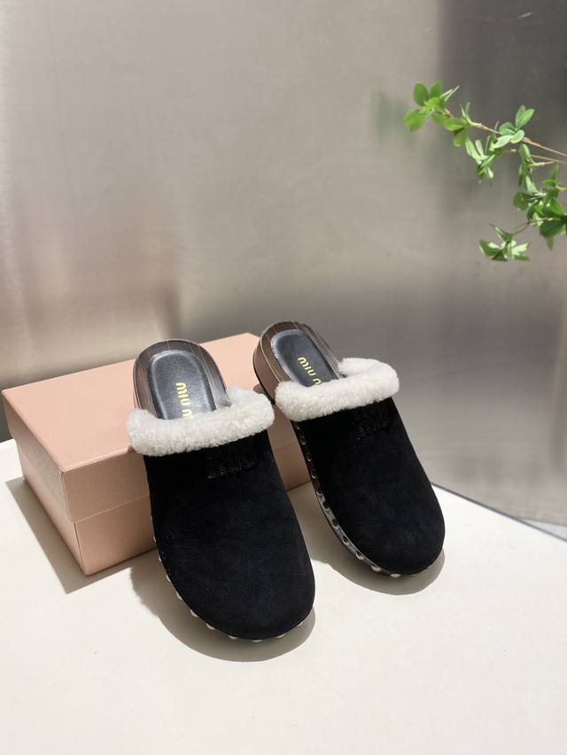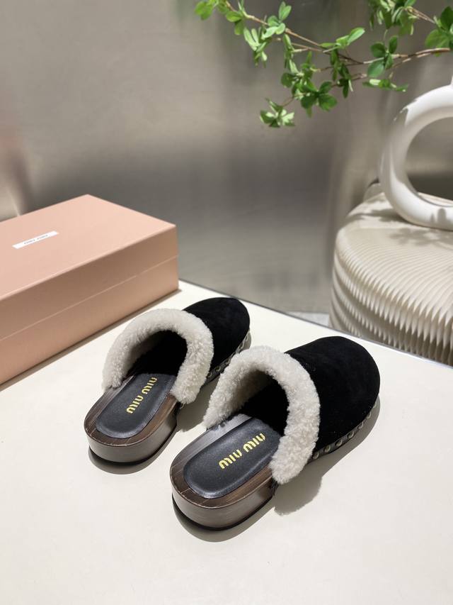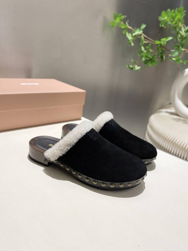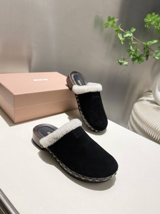 出厂 缪缪新款秋冬羊毛包头半拖,上脚舒适柔软,上脚特别方便,懒人拖鞋随走随穿 DDD 鞋面牛反绒内里羊毛,羊皮垫脚,原版开模防滑pu发泡底 DDD 跟高:3Cm 35-41 40.41不退不换 DDD