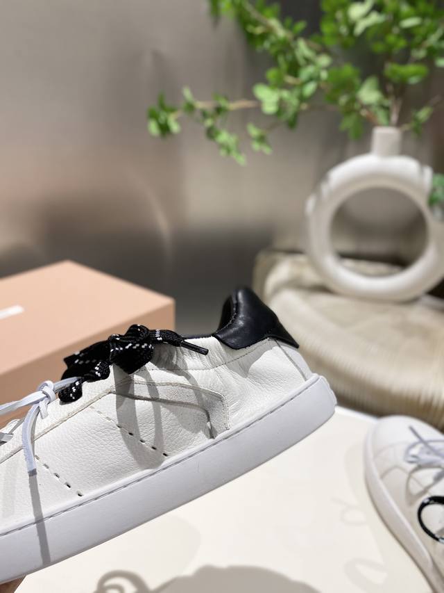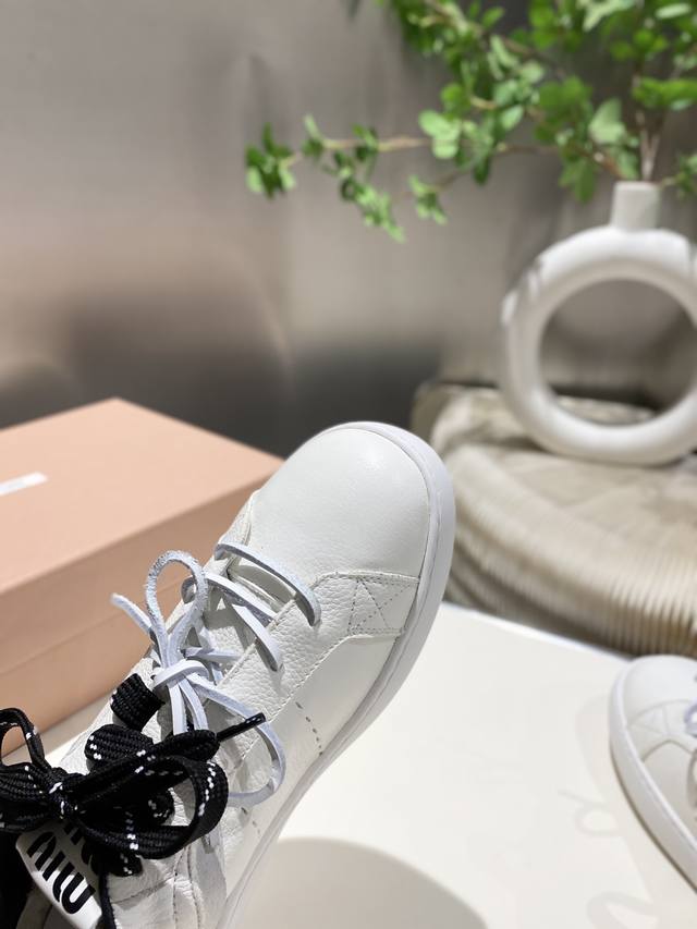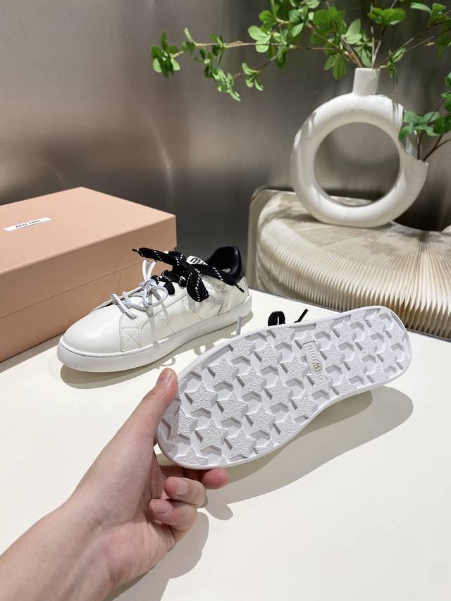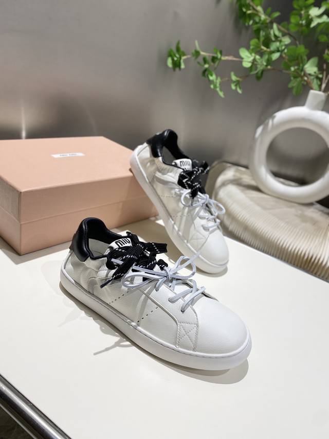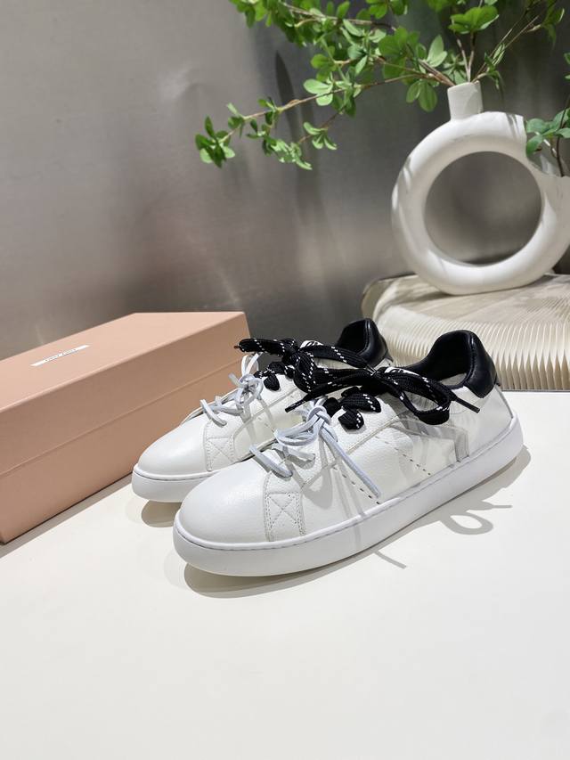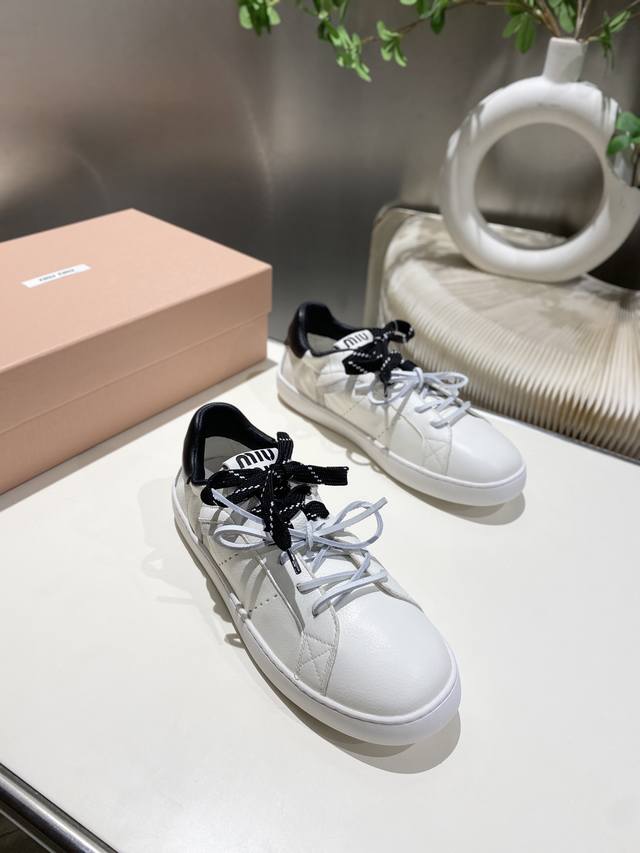 出厂 缪缪2025春夏新款 休闲小白鞋上新,官网主推款 简约的格板设计 级具辨识度的鞋舌 上脚阳光 青春,随意搭配 长裙 短裙 短裤 休闲系列都能穿出与众不同的