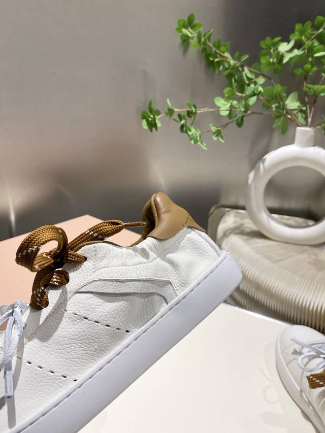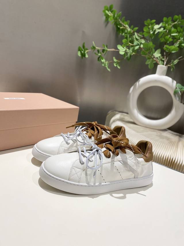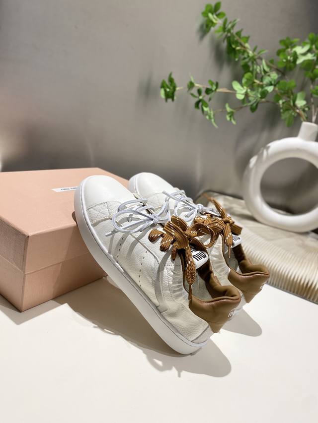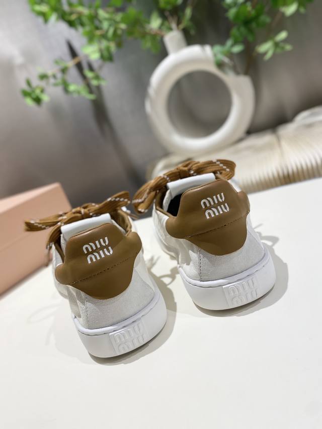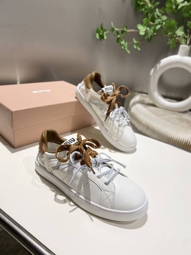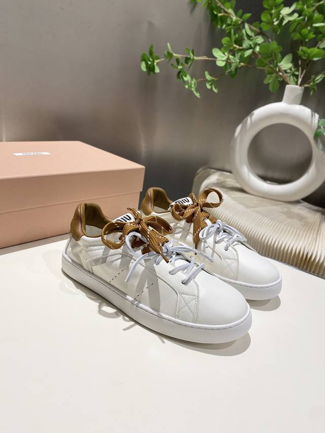 出厂 缪缪2025春夏新款 休闲小白鞋上新,官网主推款 简约的格板设计 级具辨识度的鞋舌 上脚阳光 青春,随意搭配 长裙 短裙 短裤 休闲系列都能穿出与众不同的风格 ,大底超轻Ip发泡底 ,内里头层牛里 .面料一比一复刻 做旧擦色工艺 码数35-39 34_40,41 不退不换 DDD