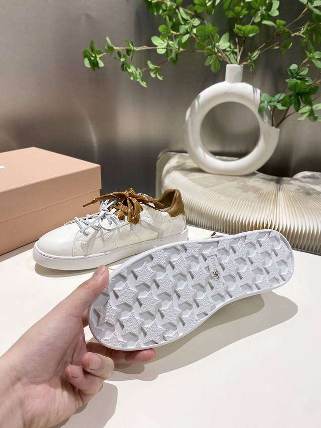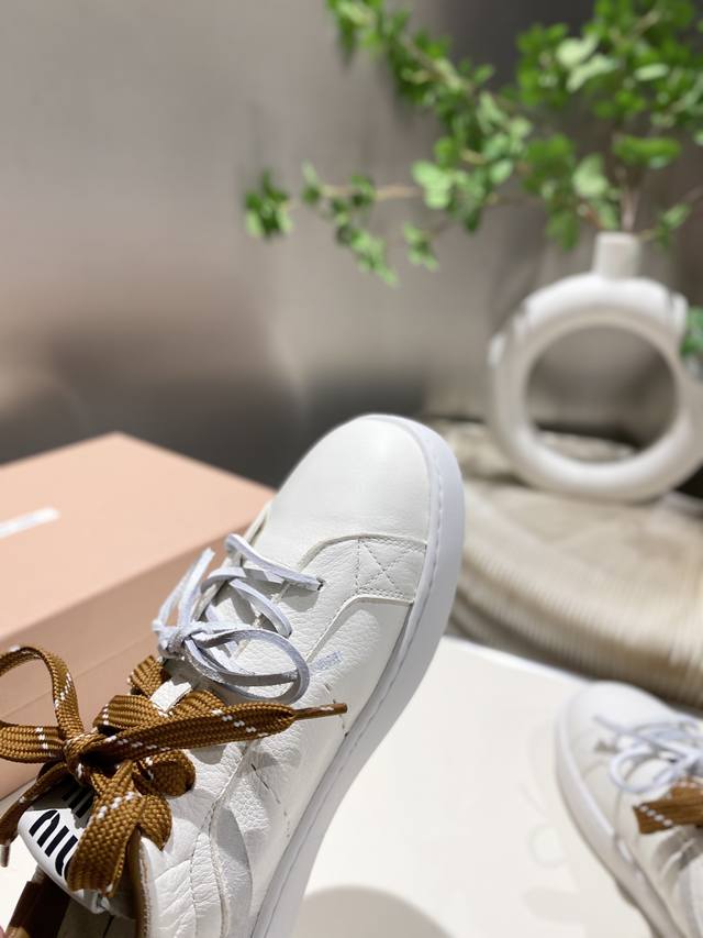 / 出厂 缪缪2025春夏新款 休闲小白鞋上新,官网主推款 简约的格板设计 级具辨识度的鞋舌 上脚阳光 青春,随意搭配 长裙 短裙 短裤 休闲系列都能穿出与众不同的