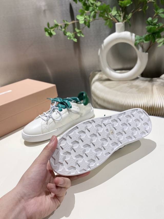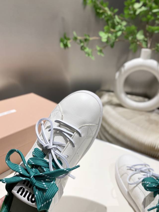 / 出厂 缪缪2025春夏新款 休闲小白鞋上新,官网主推款 简约的格板设计 级具辨识度的鞋舌 上脚阳光 青春,随意搭配 长裙 短裙 短裤 休闲系列都能穿出与众不同的