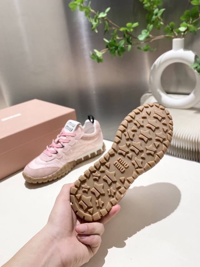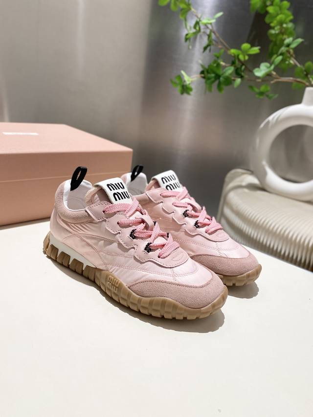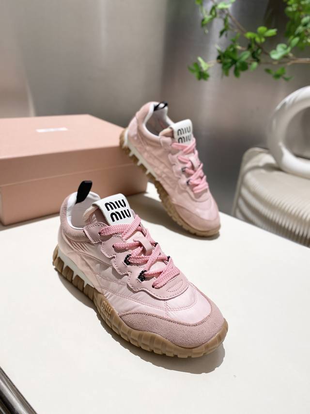 / 出厂 缪缪2025阿甘休闲鞋运动鞋 春夏新款 最近爆款前卫大胆的设计 .Miu风格融于此款厚底帆布运动鞋的简约线条 ,别致徽标饰于鞋舌与背后,点缀复古 厚底设计