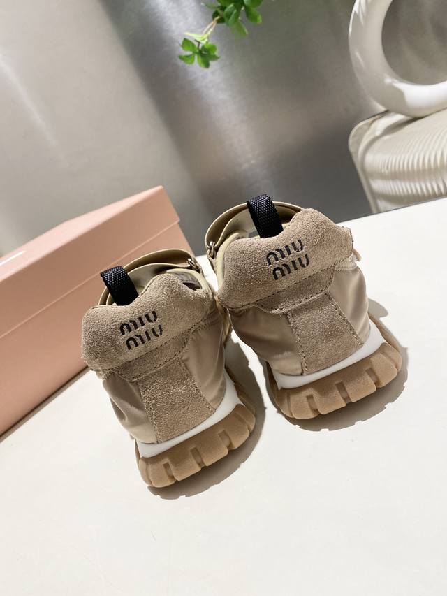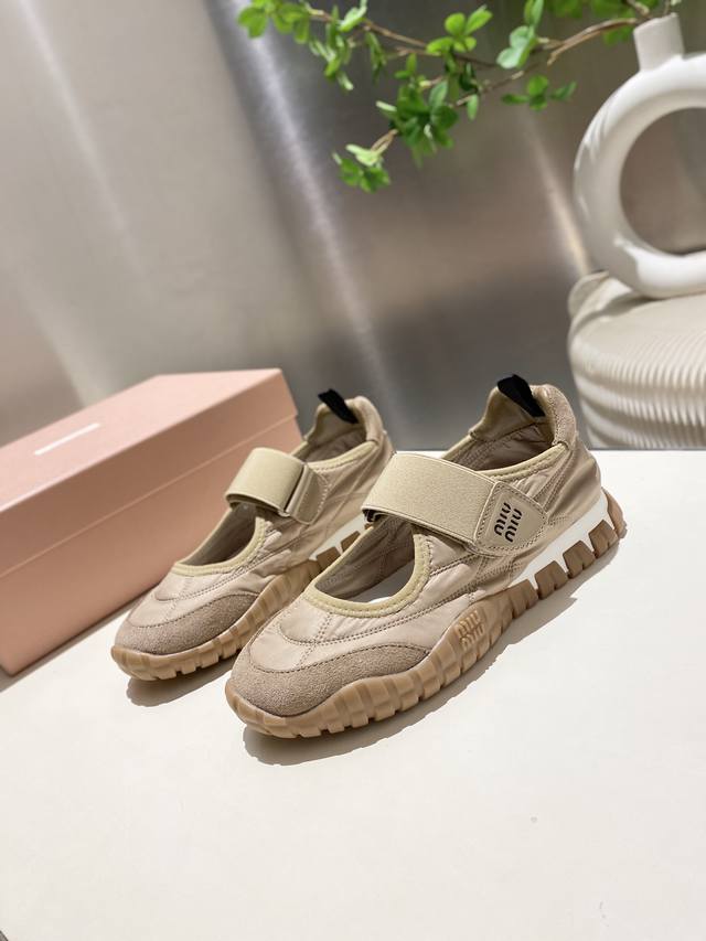 / 出厂 缪缪2025阿甘休闲鞋运动鞋 春夏新款 最近爆款前卫大胆的设计 .Miu风格融于此款厚底帆布运动鞋的简约线条 ,别致徽标饰于鞋舌与背后,点缀复古 厚底设计