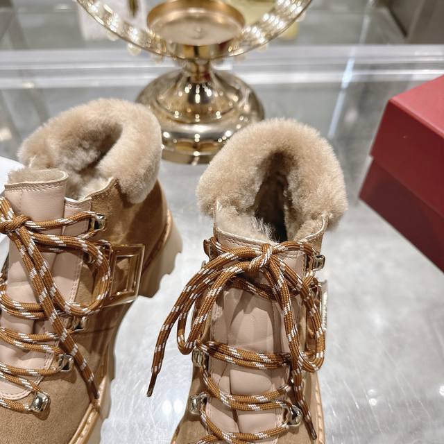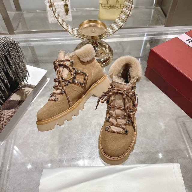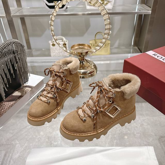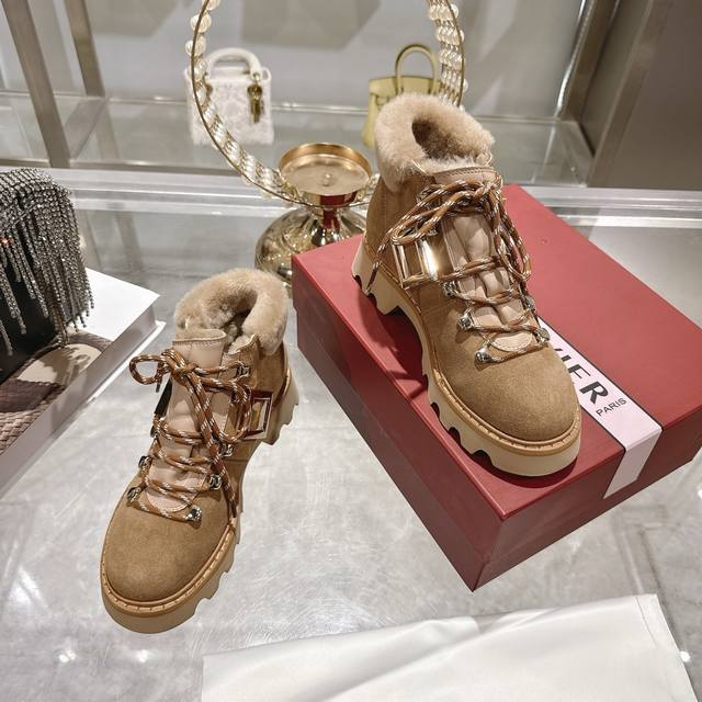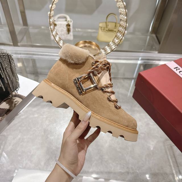 出厂 顶级品质 Roger Vivier Fw25 Mew Arrival~ Rv 罗杰维维亚秋冬新款羊毛短靴 Viv' Rangers T Ruck系列|个性又不失精致 皮毛一体设计!秋冬氛围感拉满靴子以绒面 皮革制成,搭配防滑鞋底 标志性金属饰扣点缀,轻松为任意造型增添个性!超轻发泡厚底 增高又显腿长~羊毛内里保暖又舒适~冬天必备良品! 鞋面:A级牛京+牛皮 皮毛一体 跟高:5Cm 增高又显腿长 Size:35-39. 40订做不退换
