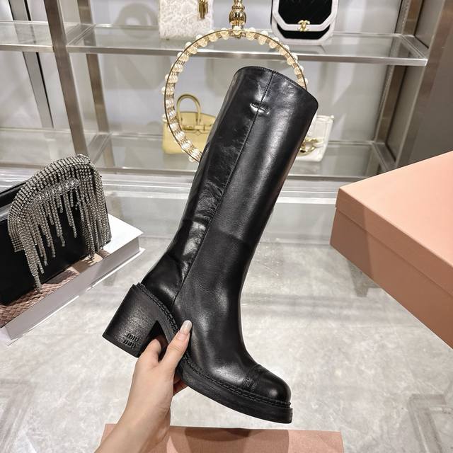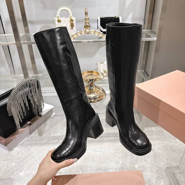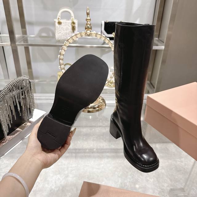 出厂 Miumiu缪缪秋冬最新款复古皮靴 长靴 DDD 超多明星时尚博主种草 当下最流行的型体隔板设计 结合美拉德色系皮料 打造中性休闲风格 复古做旧皮料高级感满满 酷感十足又不失随性 靴筒的堆堆感 极具时尚高级感 可搭配各种风格衣服 鞋面进口擦色小牛皮 大底跟高5Cm原版开模防滑大底 Size:35-41 40 41订做不退换 DDD