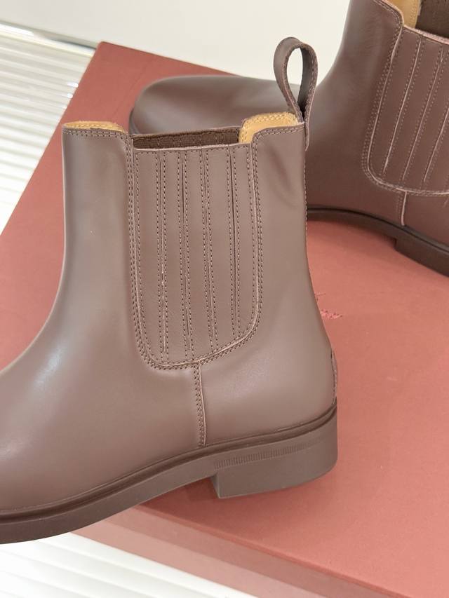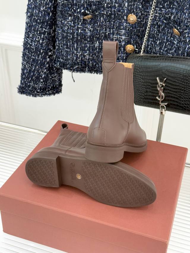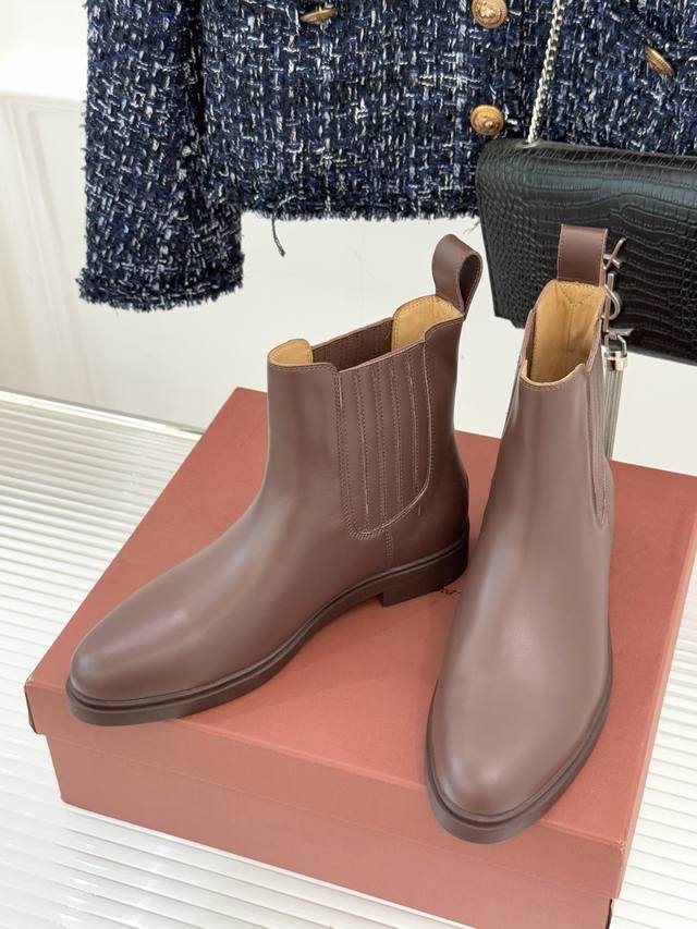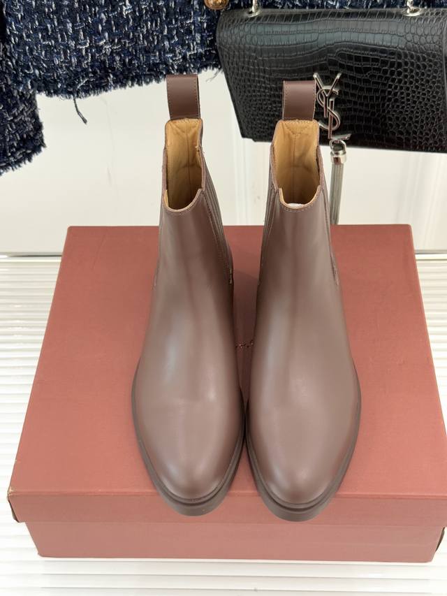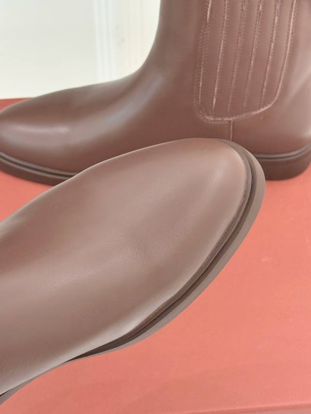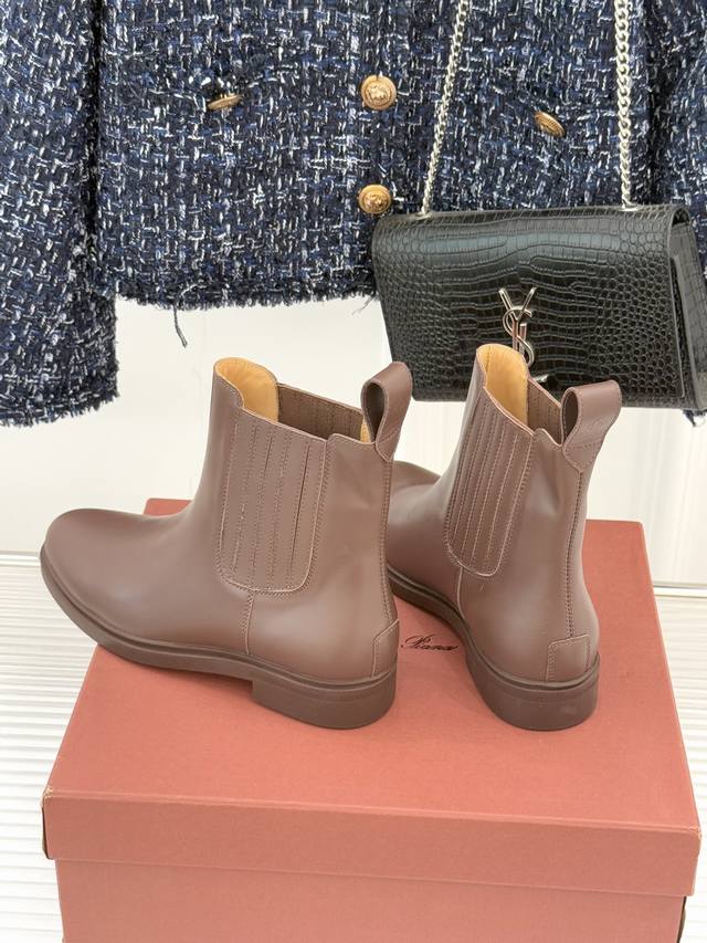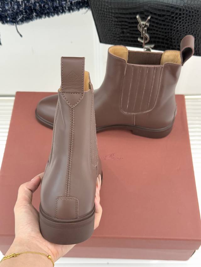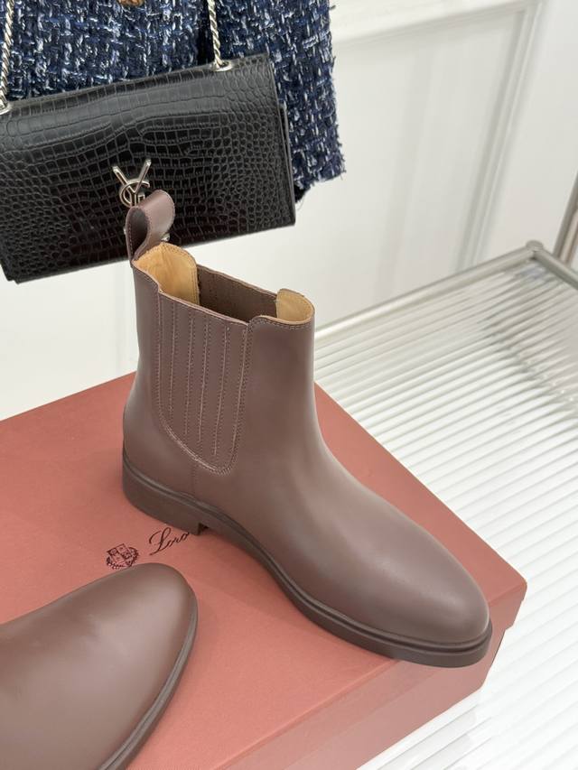 厂价 Loro Piana Lp60Wf秋冬新品复古 极简切尔西短靴 这款短靴以“隐奢美学”重塑日常格调 让每一步都成为低调品味的无声注解。 鞋型延续切尔西靴的隽永廓形, 利落线条去除冗余装饰, 仅以细腻弹性侧边嵌片呼应经典设计语言 圆鞋头与贴合脚踝的靴筒剪裁, 兼顾舒适与显瘦效果 纵向延伸腿部线条 鞋面甄选经天然蜡处理的精致牛皮革 经手工润饰呈现温润光泽与自然纹理 或是采用滚筒处理的Rugged Calf皮革 触感柔软且带着岁月沉淀的质感 意大利工艺打造的轻量化橡胶鞋底 以3厘米左右的厚度平衡支撑性与舒